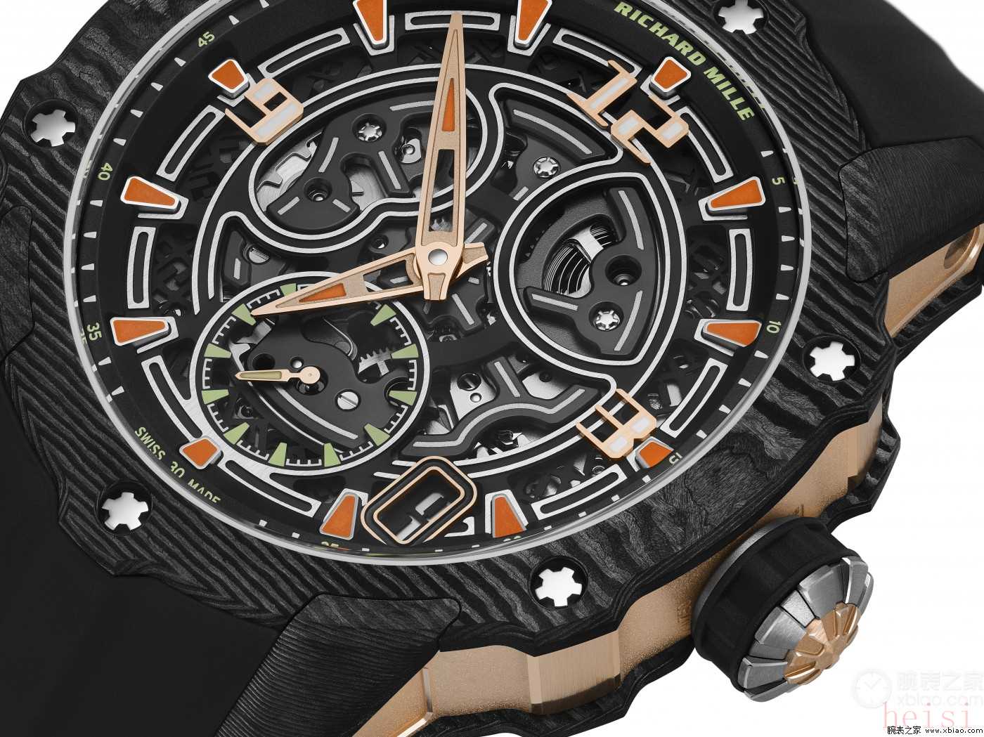 這份輕盈來自材質(zhì)的“強(qiáng)強(qiáng)聯(lián)合”:Quartz TPT?石英碳纖維的表圈和底蓋、CarbonTPT?碳纖維的表殼中件,再加上品牌最輕的彈性表帶。Quartz TPT?石英纖維材料的制作過程本身就是工藝奇跡——石英纖維被分成不超過45微米的薄層,浸泡在RICHARD MILLE專屬樹脂里,以45度角交錯(cuò)堆疊,在6巴壓力、120度高溫下成型。這種材料不僅輕,還耐造:耐高溫、抗電磁波,不會(huì)像金屬那樣在運(yùn)動(dòng)時(shí)貼著手腕發(fā)燙,也不會(huì)因?yàn)楹顾P。