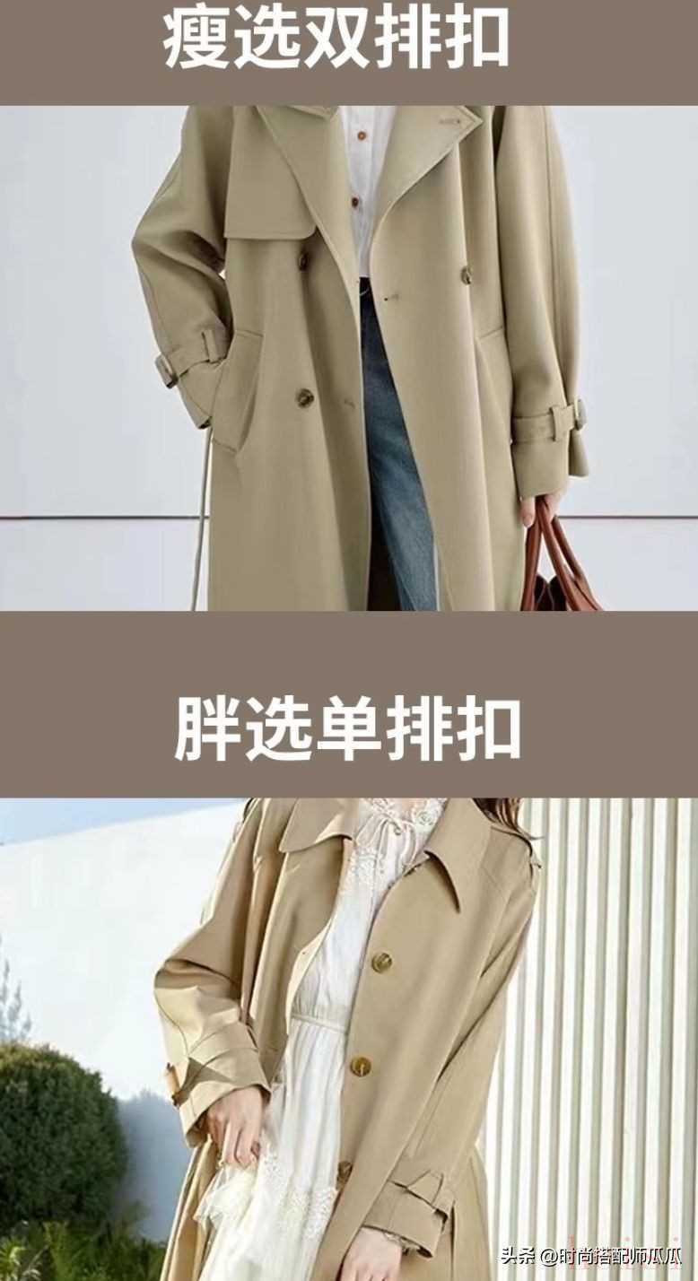 身材偏瘦的姐妹,可以嘗試一下雙排扣風衣,能夠讓你看上去更加時尚大氣;微胖型的身材,則更適合穿單排扣風衣,簡潔利落還能甩掉臃腫感。