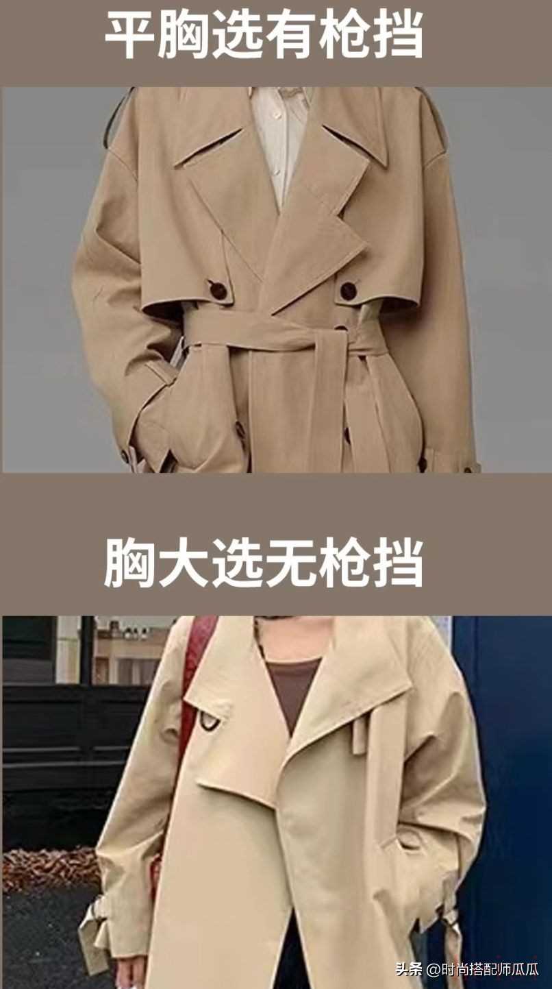 風衣選對了,只能讓你成為秋季街頭一道亮麗的風景線,挑選風衣,除了根據(jù)身材上版型,還要按照你的胸圍,決定風衣的槍擋設(shè)計,平胸的姐妹,建議可以選擇有槍擋設(shè)計的風衣,增加胸部立體感。
