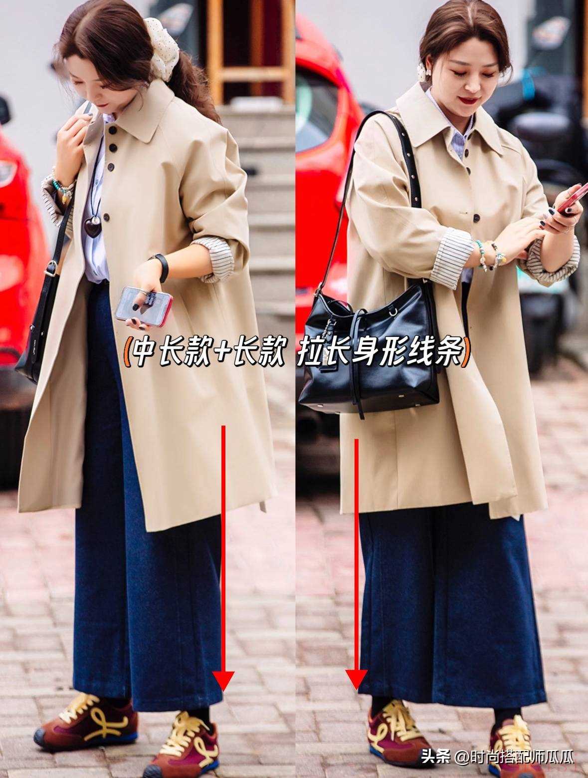 小個子再搭配中長款風衣時,不建議配短褲短裙,直接暴露腿部線條,換成及腳踝長度的長褲、長裙,再通過對比色豐富造型,視覺上可以延長身形線條,配平底鞋也很顯高。