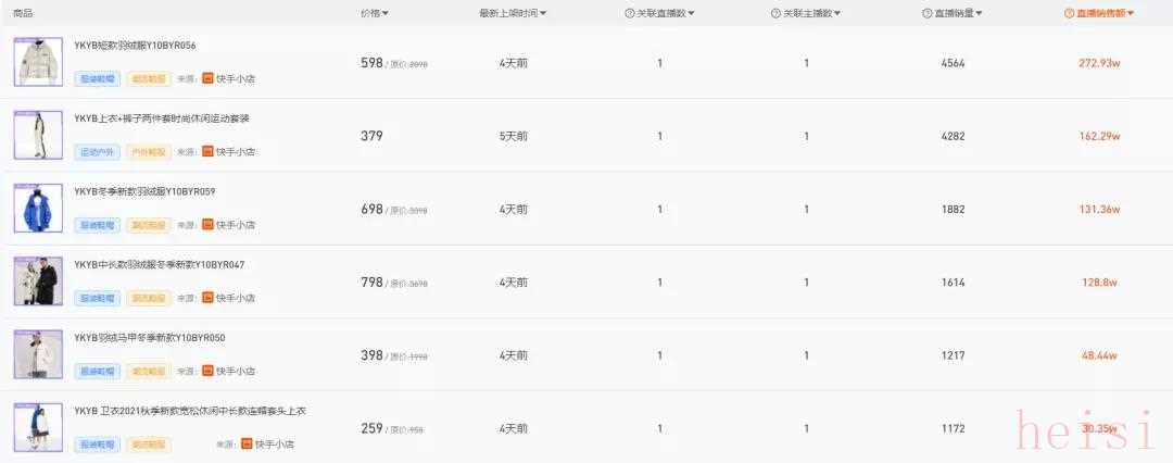 圖片來源:新快點(diǎn)擊跳轉(zhuǎn)小程序查看更多快手?jǐn)?shù)據(jù)由黃子韜擔(dān)任主理人的服飾品牌YK&YB在直播間的出現(xiàn)頻率最高,一共上架9款,小到洗臉發(fā)箍,大到衛(wèi)衣、羽絨服,類型多樣,總銷量達(dá)到3.6萬件,總銷售額達(dá)到795.5萬元。