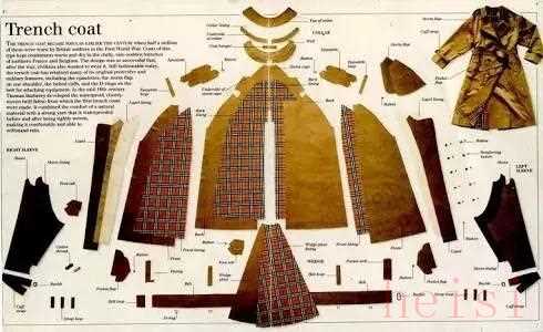 工藝:每制造一件 Burberry Trench 需要 100 個裁縫的傾力合作,超過 300 個機密工序,每一個衣領都是手工費時 21 分鐘縫制完成,是整件風衣中最復雜的工藝,沒有之一。最少要通過 26 個獨立的審查程序,而這些都要保證在英格蘭的 Castleford 制造。