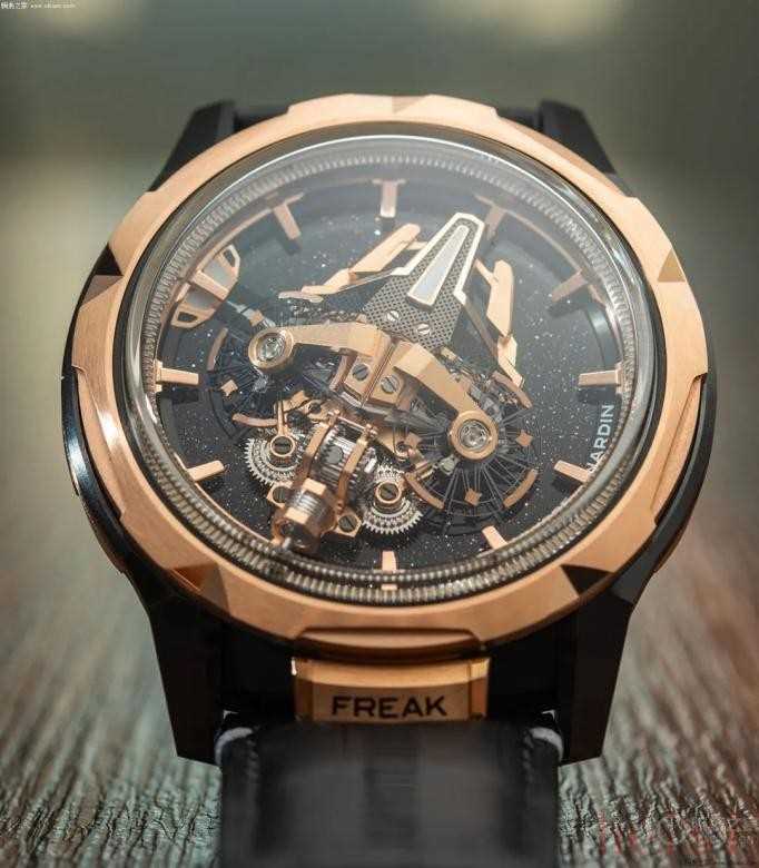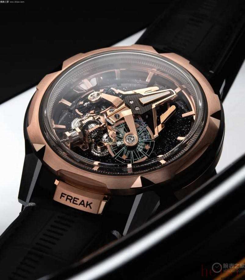 ▲雅典奇想FreakS雅典表奇想FreakS,尺寸45毫米,表頭由玫瑰金、鍍黑鈦金屬、陶瓷組成。UN-251機(jī)芯擺頻18000次/時,動力72小時。限量75只,售價(jià)接近100萬。