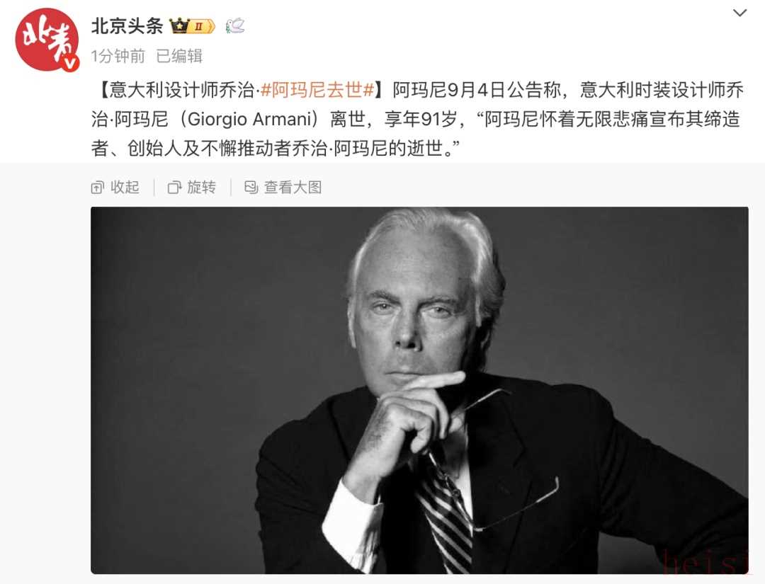 9月4日,據(jù)北京報道,阿瑪尼9月4日公告稱,意大利時裝設計師喬治·阿瑪尼(Giorgio Armani)離世,終年91歲,“阿瑪尼懷著無限悲痛宣布其締造者、創(chuàng)始人及不懈推動者喬治·阿瑪尼的逝世?!?/p>