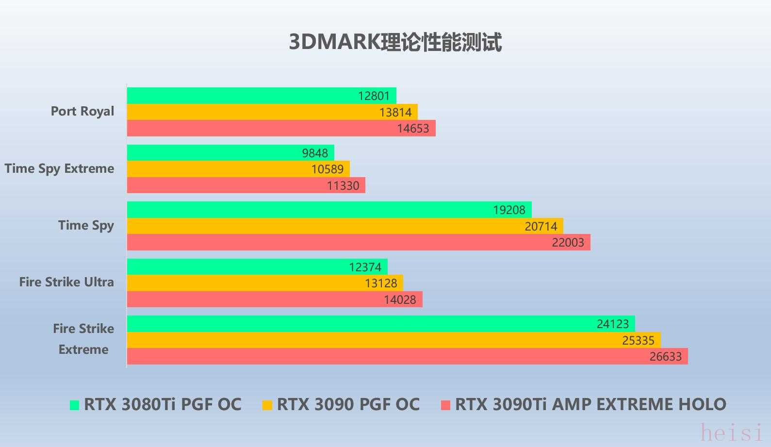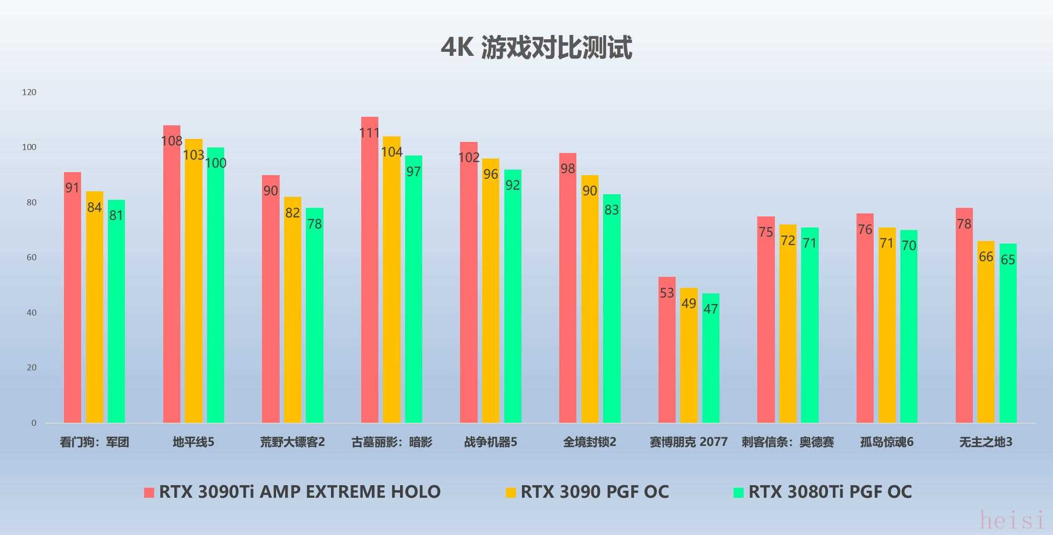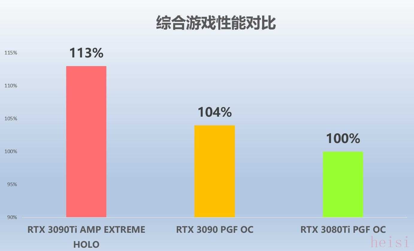 從實(shí)際測(cè)試數(shù)據(jù)可以看到,性能基本和理論測(cè)試的差距不是很大,在4K分辨率下,三款頂尖顯卡都足可輕松駕馭各類3A游戲大作了。綜合游戲性能對(duì)比,索泰RTX 3090Ti AMP EXTREME HOLO相比于RTX 3080Ti整體提升約13%左右。