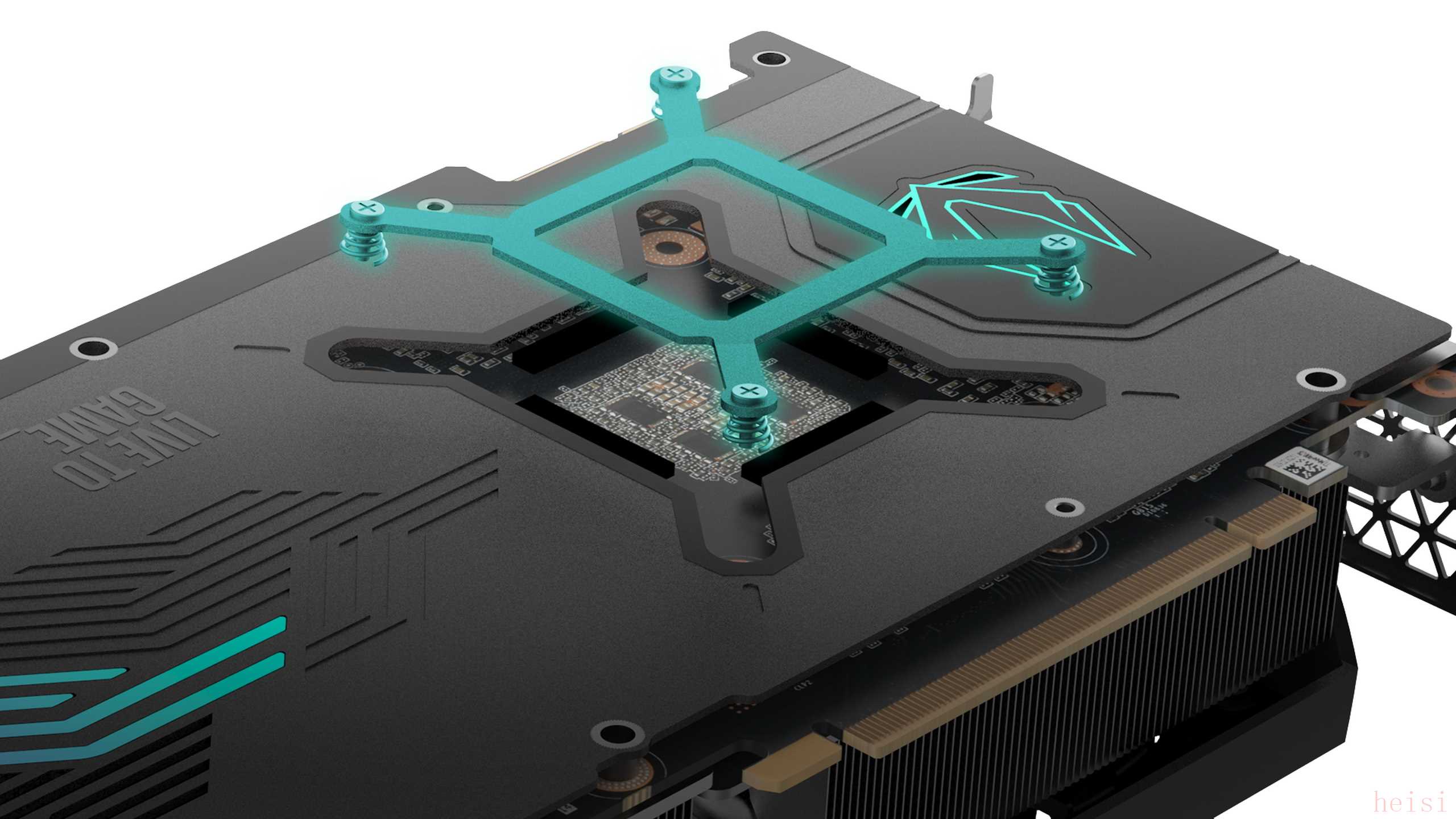 極光裝甲背板使用高強(qiáng)度鋁合金制造,通過多點(diǎn)反鎖結(jié)構(gòu),保護(hù)顯卡PCB不會(huì)彎曲變形;同時(shí)起到降低顯存和PCB溫度的作用;特別增添的PGF LOGO信仰燈點(diǎn)綴背板,全新的對(duì)流穿透散熱設(shè)計(jì),兼顧整體美感的同時(shí),讓散熱效率大大提升。