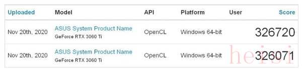 現(xiàn)在Geekbench已經(jīng)公布了英偉達(dá)RTX3060Ti的兩次跑分分?jǐn)?shù),均超過32萬分,最高的一次達(dá)到了326720分。作為對比,RTX2080 SUPER的Geekbench 4跑分水平在30萬到31萬左右。根據(jù)之前英偉達(dá)公布的數(shù)據(jù),RTX3060Ti同樣也比RTX2080 SUPER速度更快。
