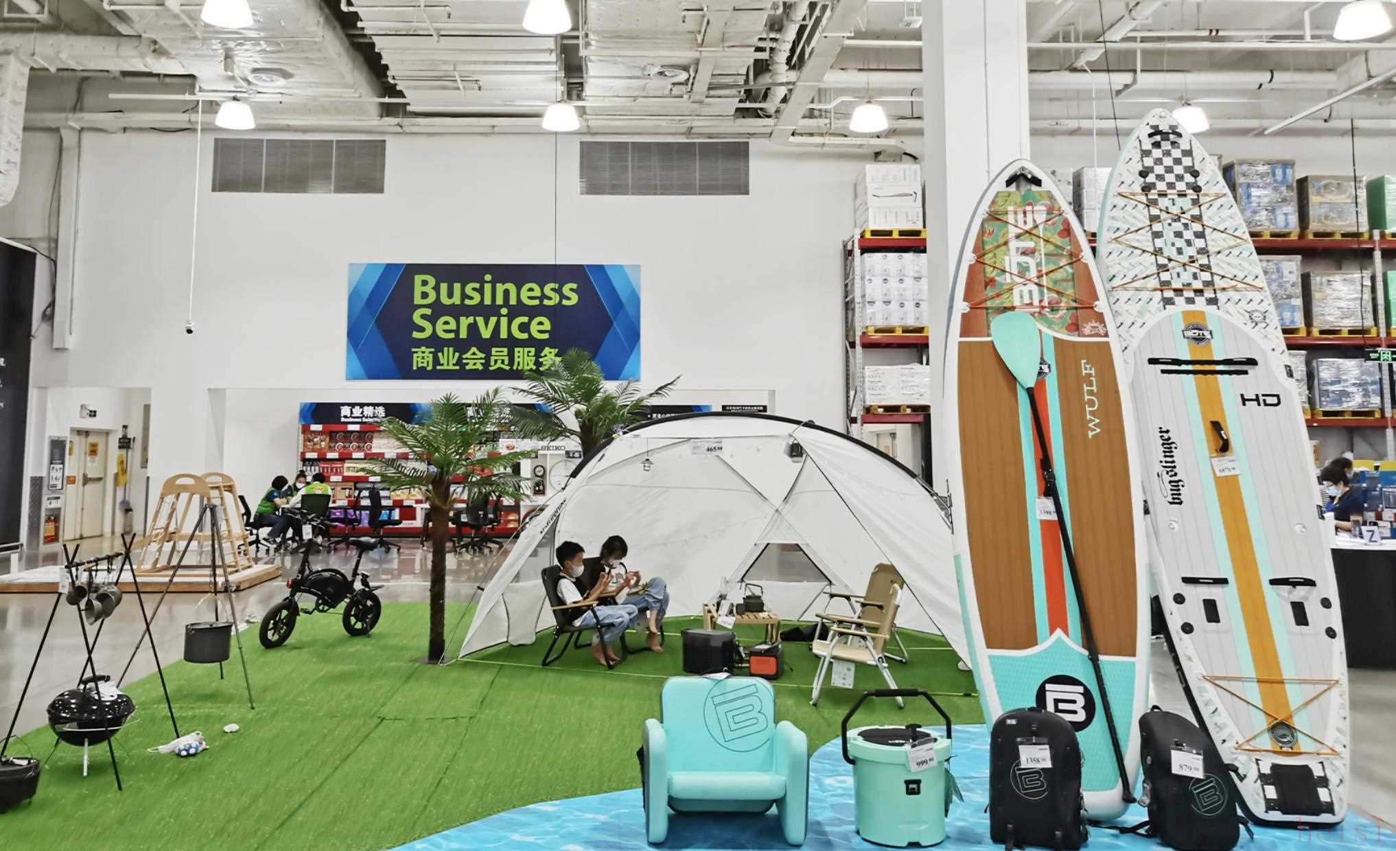 在產(chǎn)品分區(qū)上,三家會員店在基本生活物資、日化、家電均有成熟的分區(qū)和品牌加持。而精細(xì)到新穎的業(yè)態(tài),則千差萬別。新京報(bào)記者體驗(yàn)發(fā)現(xiàn),山姆會員店專門設(shè)置了露營戶外、寵物專區(qū),除了基本的露營設(shè)備、寵物用品之外,山姆在這兩個區(qū)域內(nèi)還引入了更為專業(yè)的裝備。在露營戶外區(qū)域,山姆引入了車邊帳篷、車頂帳篷等專業(yè)、高階露營裝備,小至露營快客杯,大至配有投影幕布的廳室?guī)づ瘛ote Wulf充氣式槳板,一應(yīng)俱全,在該區(qū)域,可以實(shí)現(xiàn)一站式購齊戶外露營產(chǎn)品。