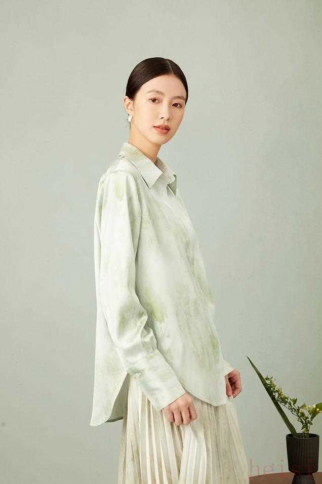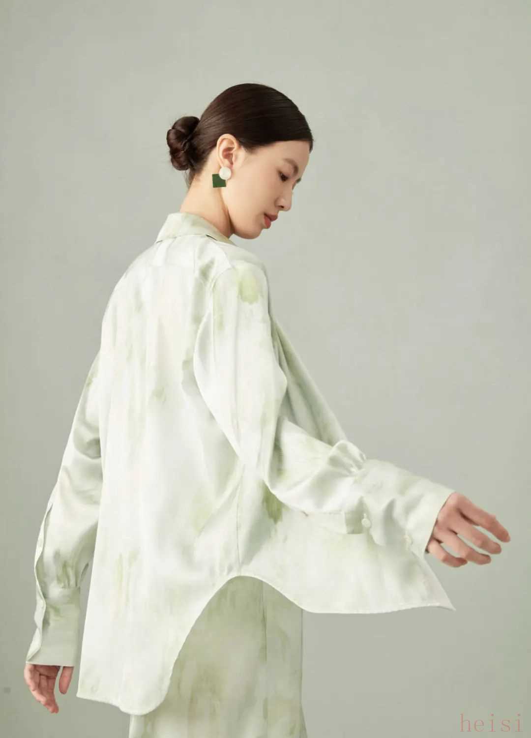 若隱若現(xiàn)的翠色,如林間碧煙暈染,又如湖水碧波蕩漾。綠意水汽并存,宛如線(xiàn)線(xiàn)綠煙縈繞。寬型袖口配兩顆袖扣,襯衫帶來(lái)的利落氣質(zhì)立刻提升。下擺弧形,優(yōu)雅浪漫,單穿也有風(fēng)格的襯衫。緊致垂感的面料,涼爽有型不易起皺。