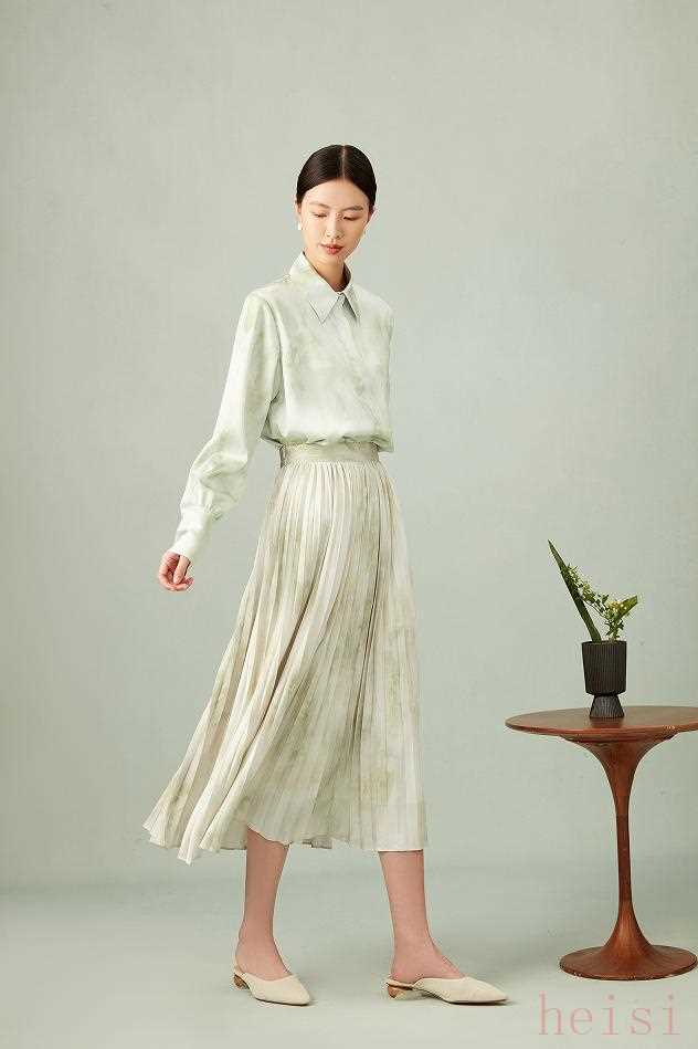 兩色可選。純色春碧為醋酸面料,手感軟滑,垂感和透氣性俱佳;印花瓷秘色為聚酯面料,柔滑細(xì)膩、色彩淡雅。