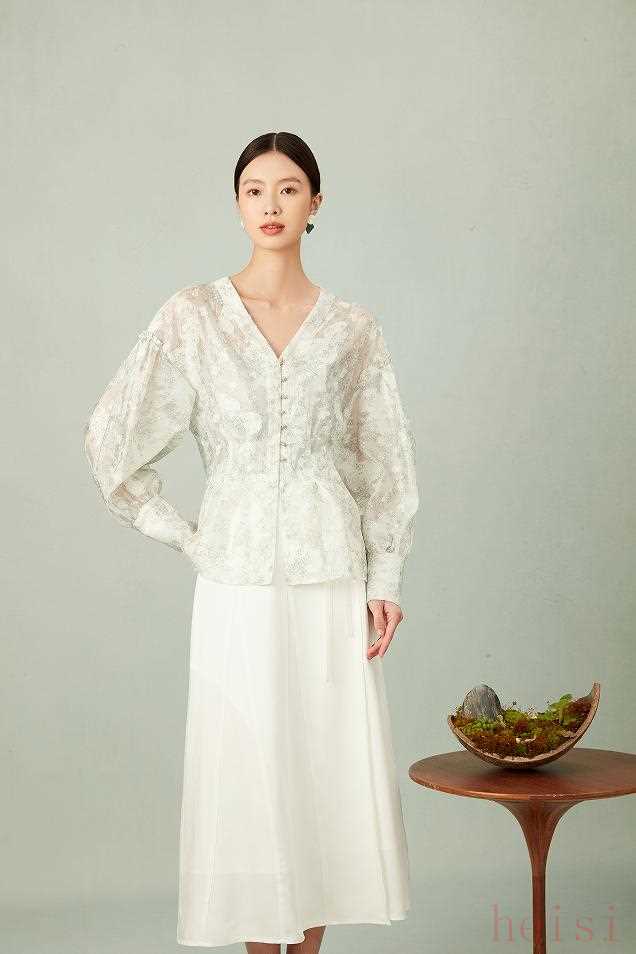 V領(lǐng)收腰設(shè)計(jì),落肩結(jié)合燈籠袖,肩線(xiàn)處疊加小木耳邊,增加了時(shí)尚之美。面料采用印花+爛花工藝,呈現(xiàn)出半透明的立體質(zhì)地。襯衫寬袖口設(shè)計(jì),四顆袖口,柔美之中又增添了幾分英氣。女性的浪漫風(fēng)格被表現(xiàn)得淋漓盡致,豐富的層次感在淡色面料上如花綻開(kāi)。胸前點(diǎn)綴幾顆精致造型玉石扣,讓整件衣服的質(zhì)感更加獨(dú)特。