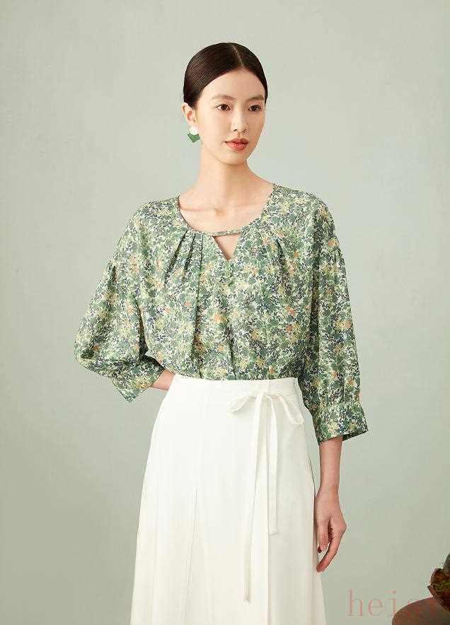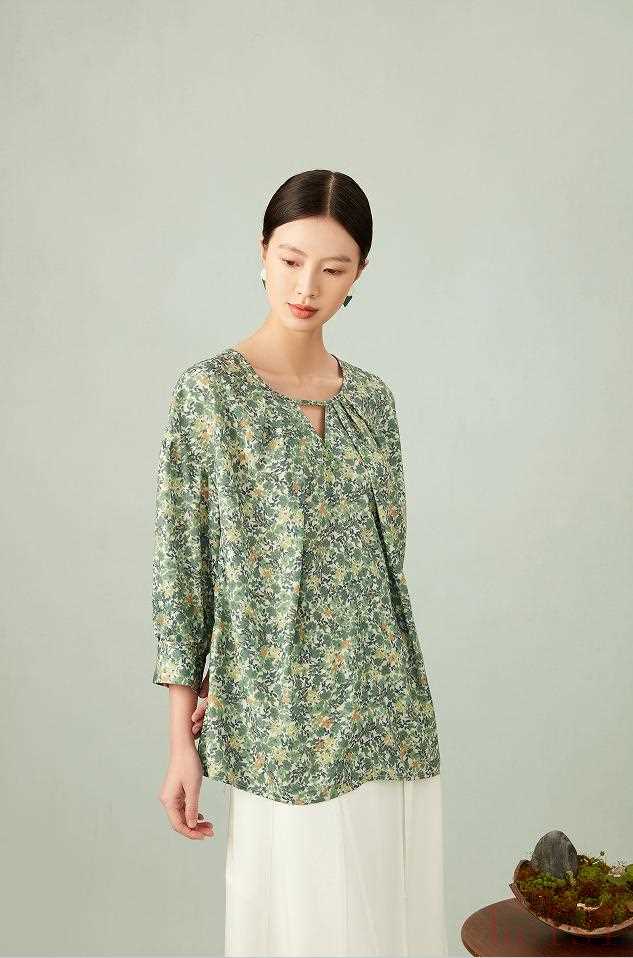 優(yōu)質(zhì)的聚酯纖維面料,輕柔親膚、不易起皺。上衣是寬松的中長(zhǎng)款落肩設(shè)計(jì),圓領(lǐng)鏤空并配以細(xì)褶增加了領(lǐng)口的細(xì)節(jié)。八分袖收攏袖口,形成袖型的弧線(xiàn),提升精致感。深深淺淺的綠葉點(diǎn)綴淡黃色小花,夏日繁花的榮榮之貌撲面而來(lái)。