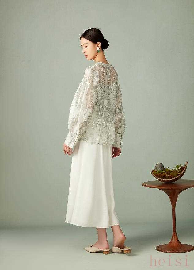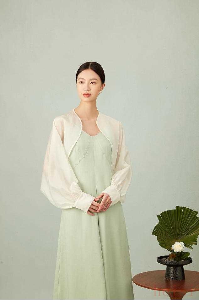 面料采用萊賽爾纖維,如紗似霧、舒適透氣、清涼防曬,手感極佳,上身輕薄若無(wú)物。弧線(xiàn)無(wú)扣設(shè)計(jì),燈籠袖打造出手臂優(yōu)美線(xiàn)條,以襯衫袖口收束整個(gè)衣服的廓形,形成視覺(jué)焦點(diǎn)。夏季搭配無(wú)袖長(zhǎng)裙非常別致且涼爽,獨(dú)具特色。