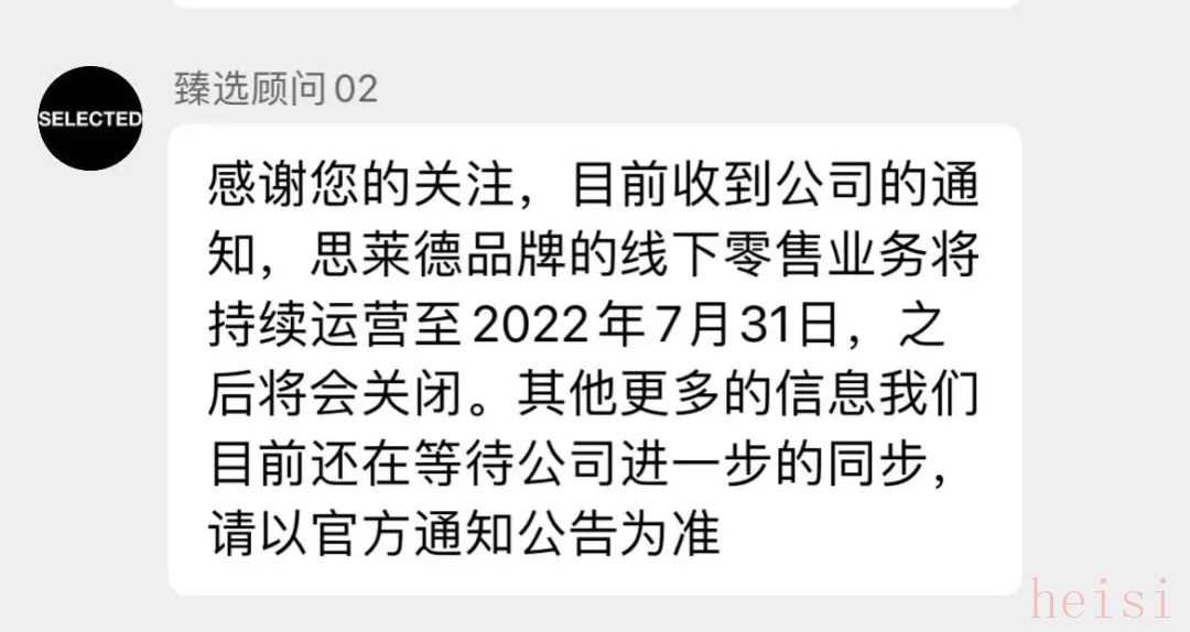 撰文:秀珍 | 編輯:李君出品:駝鹿新消費(fèi) | 微信ID:tuolu360近日,綾致集團(tuán)近日發(fā)布Selected(思萊德)終止零售業(yè)務(wù)告知函:2022年4月,綾致股東會已做出重要決定,將于今年7月31日前關(guān)閉Selected(思萊德)在中國的1300多家線下零售店鋪。
