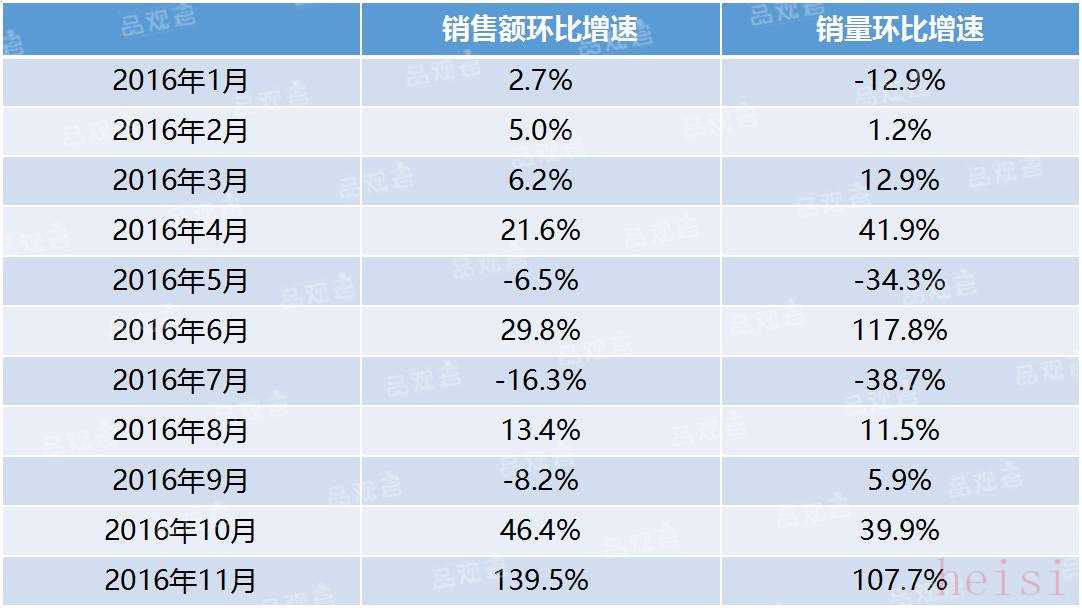 放眼全年,我們則不難發(fā)現(xiàn),2016年11月份的BB霜銷量達到了一個高峰,銷售額環(huán)比增速為139.5%,同比增速則達到107.7%;另一個高峰發(fā)生在6月,銷售額的環(huán)比增速是29.8%,同比增速則達到117.8%。