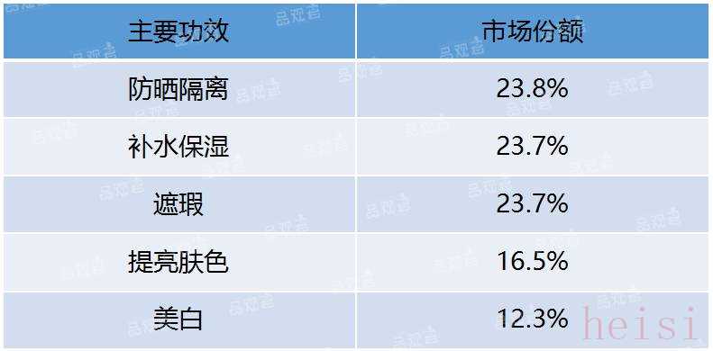 從上表我們看出,防曬隔離、補水保濕和遮瑕這三大妝效依然是消費者的主要訴求,擁有這三種功效的BB霜產(chǎn)品在市場上平分秋色。消費者并沒有那么在意BB霜是否能提亮膚色或者美白,這樣的強功效性產(chǎn)品,她們或許還是愿意靠護膚品來完成。