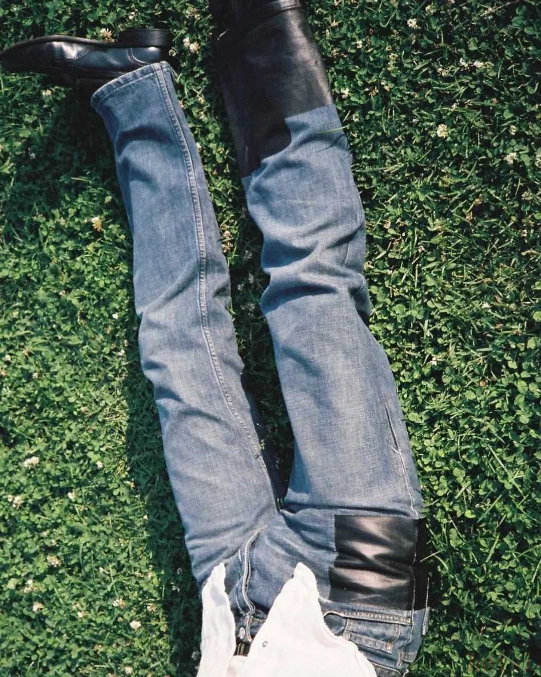 @NAN:“ 韓國(guó)博主品牌 Meantime 的拼皮做舊牛仔褲,上身很有「立體感」,落色也有 Vintage 感,早先在韓國(guó)買手店網(wǎng)站購(gòu)入,價(jià)格 1K+。 ”