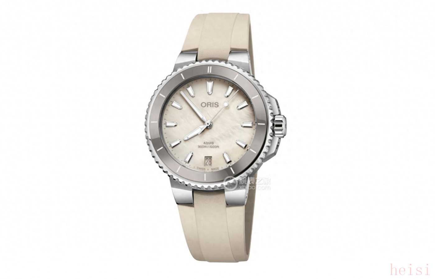 腕表點評:豪利時這塊AQUIS系列的36.5毫米腕表,第一眼看上去就很溫柔。奶油色的珍珠母貝表盤柔和耐看,表徑36.5毫米,搭配不到12毫米的厚度,是女表里非常合適的尺寸,表圈是陶瓷材質,搭配雙面拱形藍寶石鏡面,整體的細節(jié)打磨其實非常精致,算得上是小尺寸潛水表中相當有質感的一款。它只有82克重,同色系的橡膠表帶也讓它貼手又輕便(當然也可以換鋼帶),非常適合夏天或旅行時佩戴。表盤上除了六點位的日期顯示,沒有別的功能,這款表搭載的是OrisCal.733機芯,基礎為SW200-1,參數(shù)上沒什么驚喜,38小時的動力儲備中規(guī)中矩。不過對大多數(shù)女生來說,這種日常戴戴、隔天上弦的需求是完全夠用的。防水性能則相當亮眼——300米,是真正可以下海、潛水使用的等級,完全不是裝飾性的。這塊表整體給人一種柔中帶剛的感覺,功能扎實、顏值在線,也是三款中價格最友好的,性價比很高。