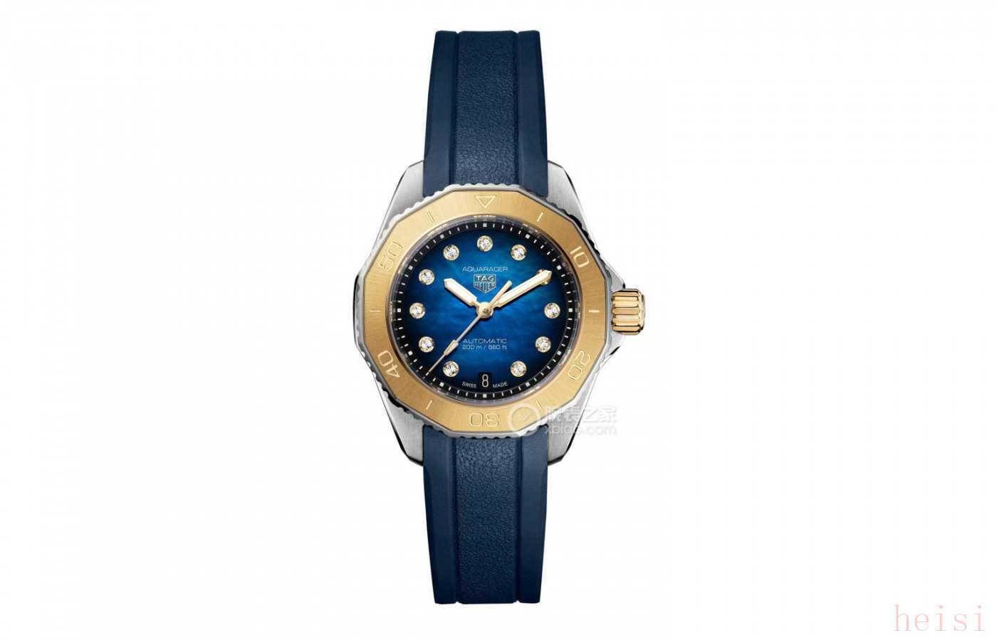 腕表點評:泰格豪雅這塊30毫米的競潛系列女表,是三款里最小巧精致的一個。它的亮點非常明顯——藍色珍珠母貝表盤+鑲鉆時標+18K鍍金指針和表圈裝飾,妥妥的是一塊在細節(jié)上下足功夫的女士腕表。不管是用來看時間,還是當配飾,這塊表的完成度都非常高。當然,它也不只有漂亮的外表。它的防水能力達到200米,對于一般潛水活動是完全夠用的。相比另外兩款它略低一些,但在實際使用場景中,游泳、浮潛、日常淋水這些完全不在話下。這塊表搭載的是Calibre 9機芯,動力儲備40小時。值得注意的是,這塊表用了密底設計,雖然沒有展示機芯,但更強調了密封性。佩戴起來也相當輕盈,不過因為整體色調偏深,可能更適合秋冬或深色系穿搭使用。價格上它是三款中最貴的,達到37900元。這主要反映在用料材質和鑲鉆工藝上。對于預算比較寬松,又想找一款能兼顧運動風和女性化設計的潛水表,這塊豪雅無疑是很值得考慮的。