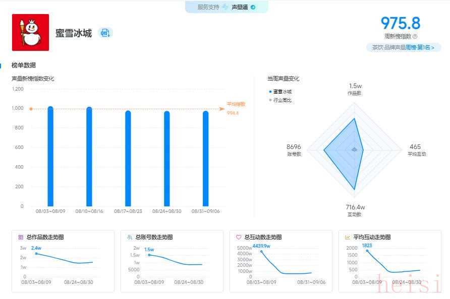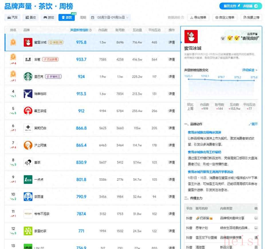 新榜品牌聲量?茶飲周榜(08 月 31 - 09 月 06 日)揭曉,蜜雪冰城以 975.8 的聲量新榜指數(shù)連續(xù)兩周位居榜首 。環(huán)比上周,作品數(shù)增加 919,賬號數(shù)增加 144 ,互動量提升 153.9w ,在茶飲市場持續(xù)領(lǐng)跑。