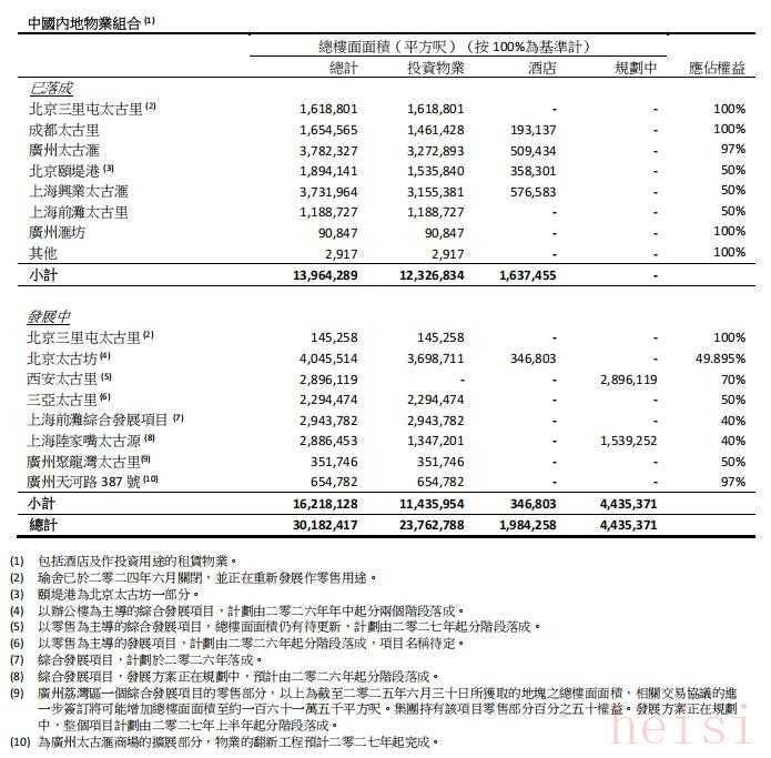 尚未落實的項目包括更多位于中國內(nèi)地一線及新興一線城市(包括北京和深圳在內(nèi))以零售為主導(dǎo)的綜合發(fā)展項目,目標(biāo)使中國內(nèi)地的總樓面面積增加一倍(截至2025年上半年,已落成96.62萬平方米);同時進一步擴充香港的太古廣場和太古坊,以及更多在香港、中國內(nèi)地、邁阿密和東南亞的住宅物業(yè)買賣項目。