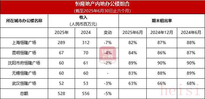 可以發(fā)現(xiàn),恒隆地產(chǎn)旗下內(nèi)地五個城市的辦公樓出租率一年內(nèi)均在下降,其中上海恒隆廣場降幅最大,達5個百分點,使得2025年上半年租賃收入下降7%,更帶動內(nèi)地辦公樓租金收入下降5%。恒隆地產(chǎn)認為,上海恒隆廣場兩座甲級辦公樓租金下降原因是上海市內(nèi)辦公樓供應(yīng)過剩和市場租金受壓。