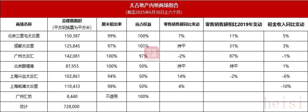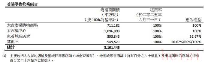 香港零售物業(yè):截至2025年6月30日,太古地產(chǎn)香港在營零售物業(yè)包括太古廣場購物商場、太古城中心、東薈城名店倉和其他物業(yè),總面積約320萬平方呎(約合29.73萬平方米)。2025年上半年,來自集團香港零售物業(yè)的應(yīng)占租金收入12.63億港元,同比下跌2%。截至期末,集團在營的香港零售物業(yè)出租率約100%,約有63.7%的租戶租約將在2027年及以后到期。但租戶零售額漲跌不均,其中,太古廣場購物商場和太古城中心的零售銷售額分別上升1%和2%,東薈城名店倉則下跌3%。而太古地產(chǎn)預(yù)計,2025年上半年香港市場整體臨時估計零售銷售額下跌3%??梢?,太古地產(chǎn)運營的零售商場運營狀況好于大市。