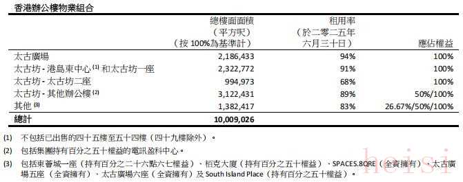 香港辦公樓:截至2025年6月30日,太古地產(chǎn)香港在營辦公樓包括太古廣場、太古坊-港島東中心和太古坊一座、太古坊-太古坊二座、太古坊-其他辦公樓及其他物業(yè),總面積約1000萬平方呎(約合92.9萬平方米),集團香港辦公樓物業(yè)綜合出租率88%,應(yīng)占總租金收入26億港元。約有84.5%的現(xiàn)有租戶租約將在2027年及以后到期。