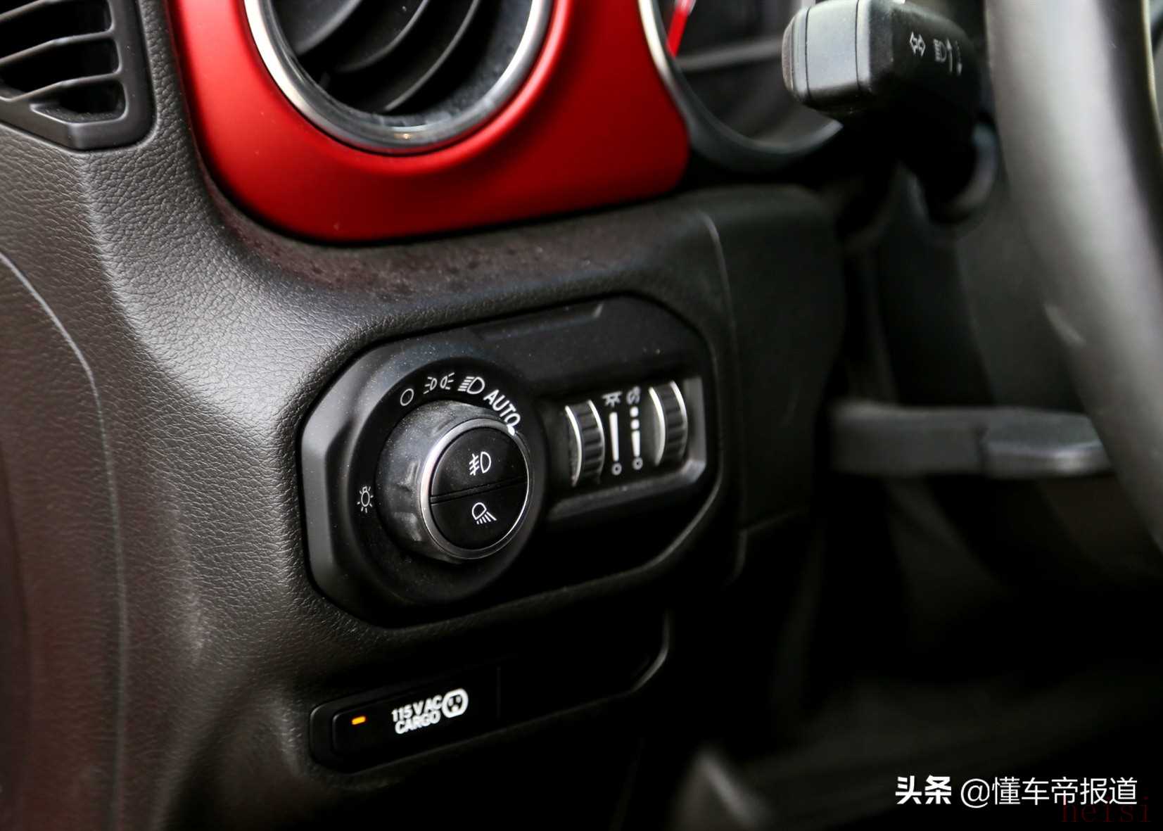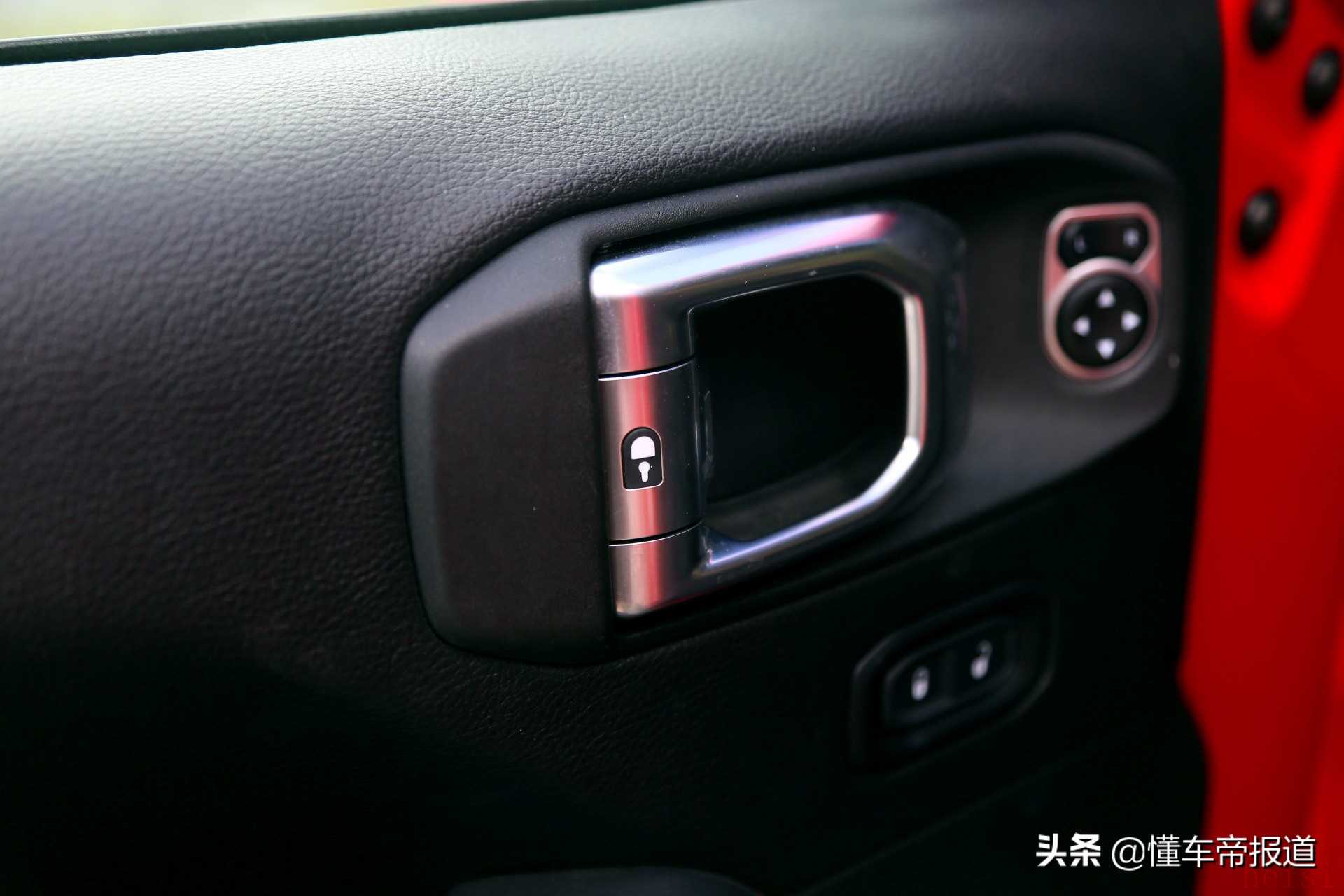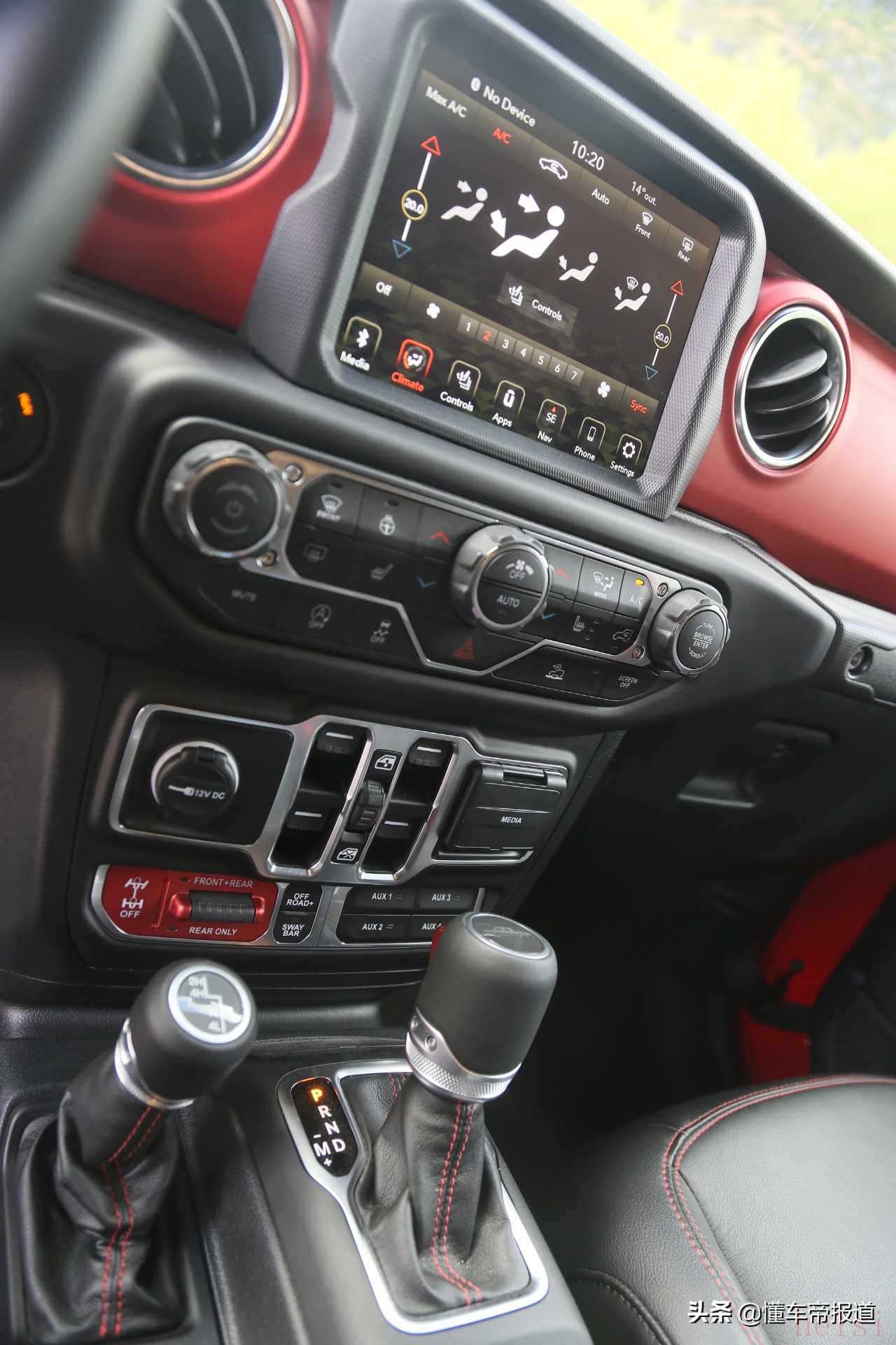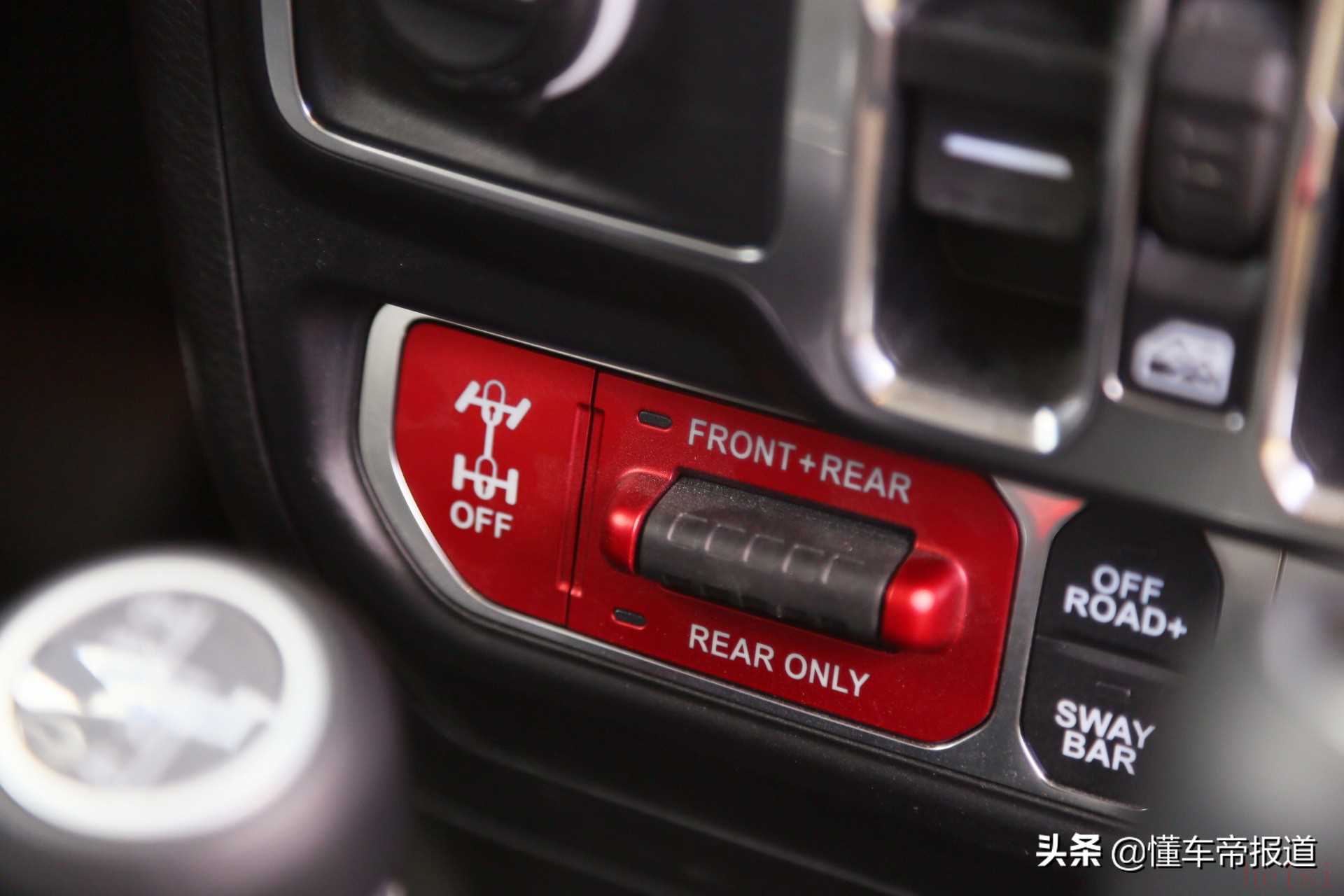 Rubican上還標(biāo)配標(biāo)志性的紅色前后差速鎖止按鈕。