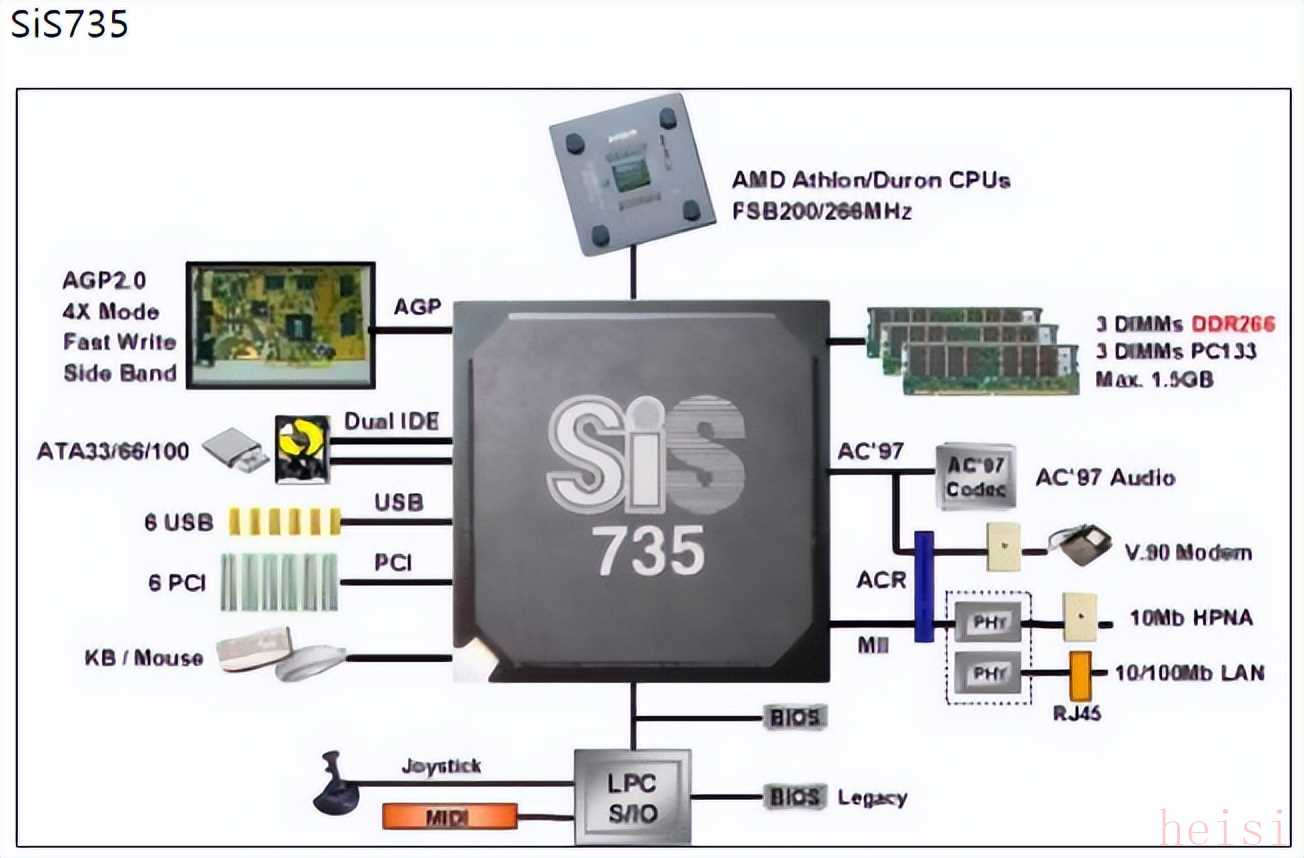 - SiS 735:兼容AMD Athlon平臺(tái),支持DDR333內(nèi)存(同期威盛僅支持DDR266)。
