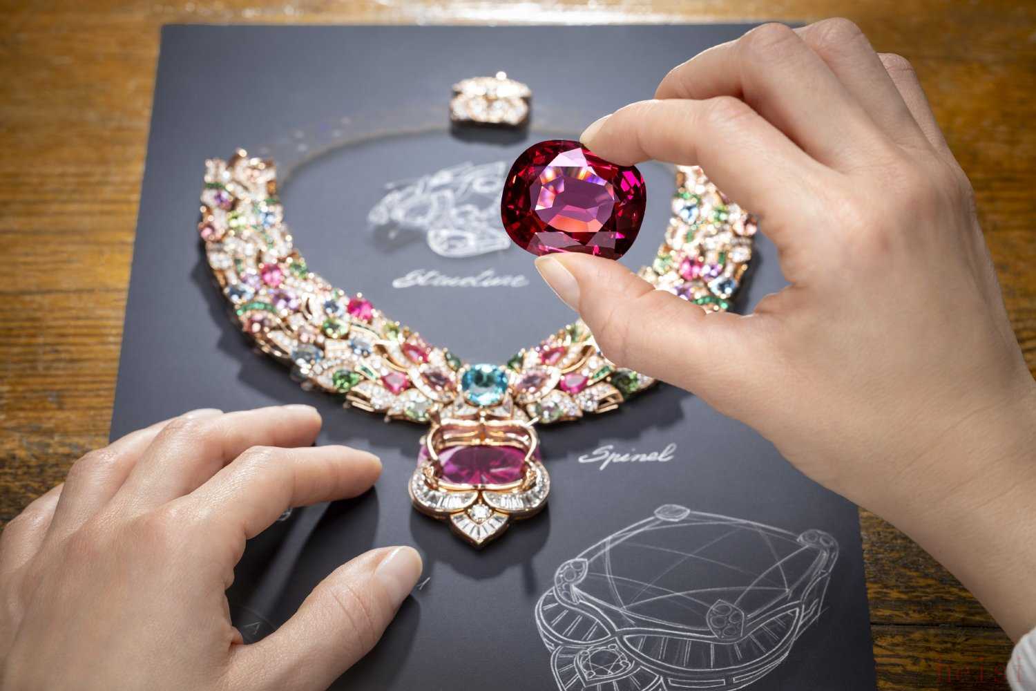 主石為一顆131.21ct枕形切割尖晶石,經(jīng)鑒定產(chǎn)自塔吉克斯坦。鑲嵌帕拉伊巴碧璽、碧璽、祖母綠、縞瑪瑙與鉆石。耗時超過2300小時制作。