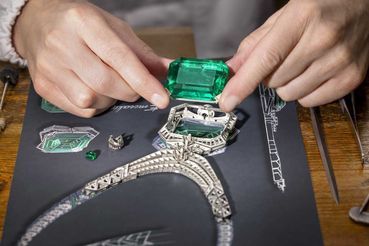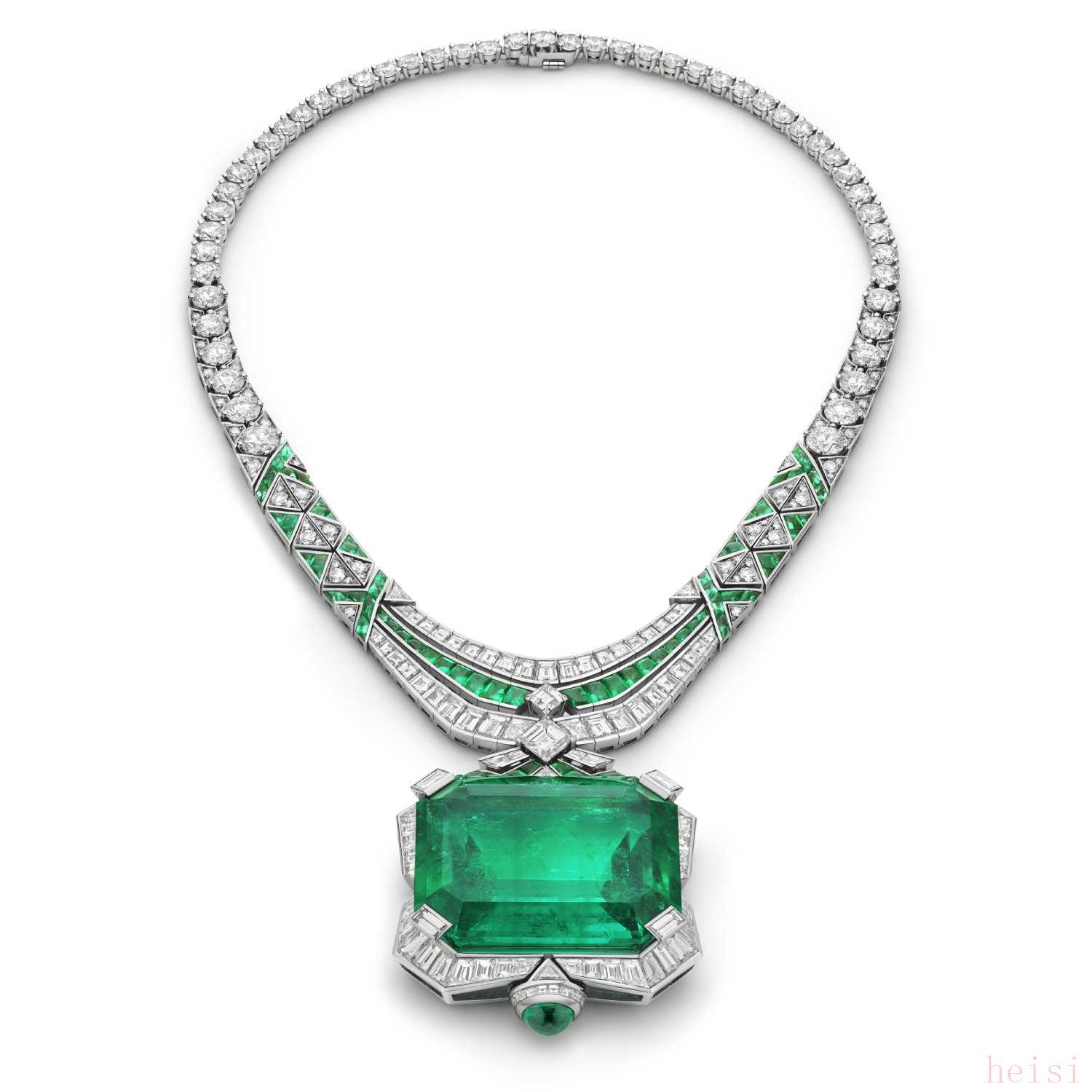 主石為一顆241.06ct阿斯徹切割祖母綠,經(jīng)鑒定產(chǎn)自哥倫比亞。鑲嵌鉆石和祖母綠。