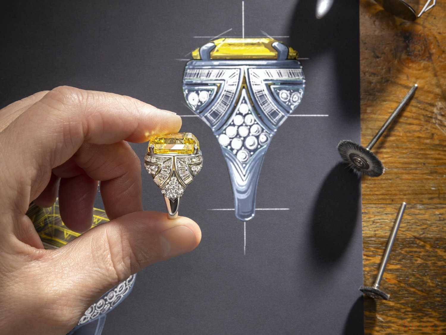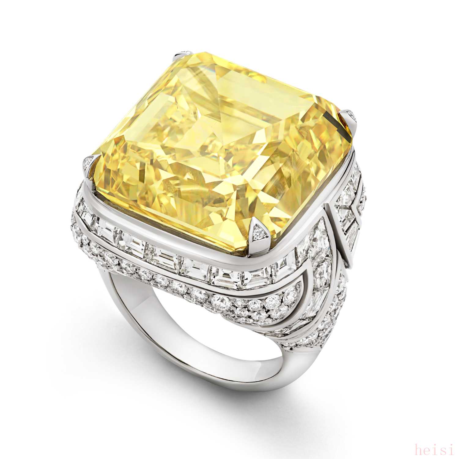 主石為一顆超過45ct阿斯徹切割黃鉆,經(jīng) GIA 鑒定為 Fancy Vivid Yellow 色級。鑲嵌階梯型和圓形切割無色鉆石。