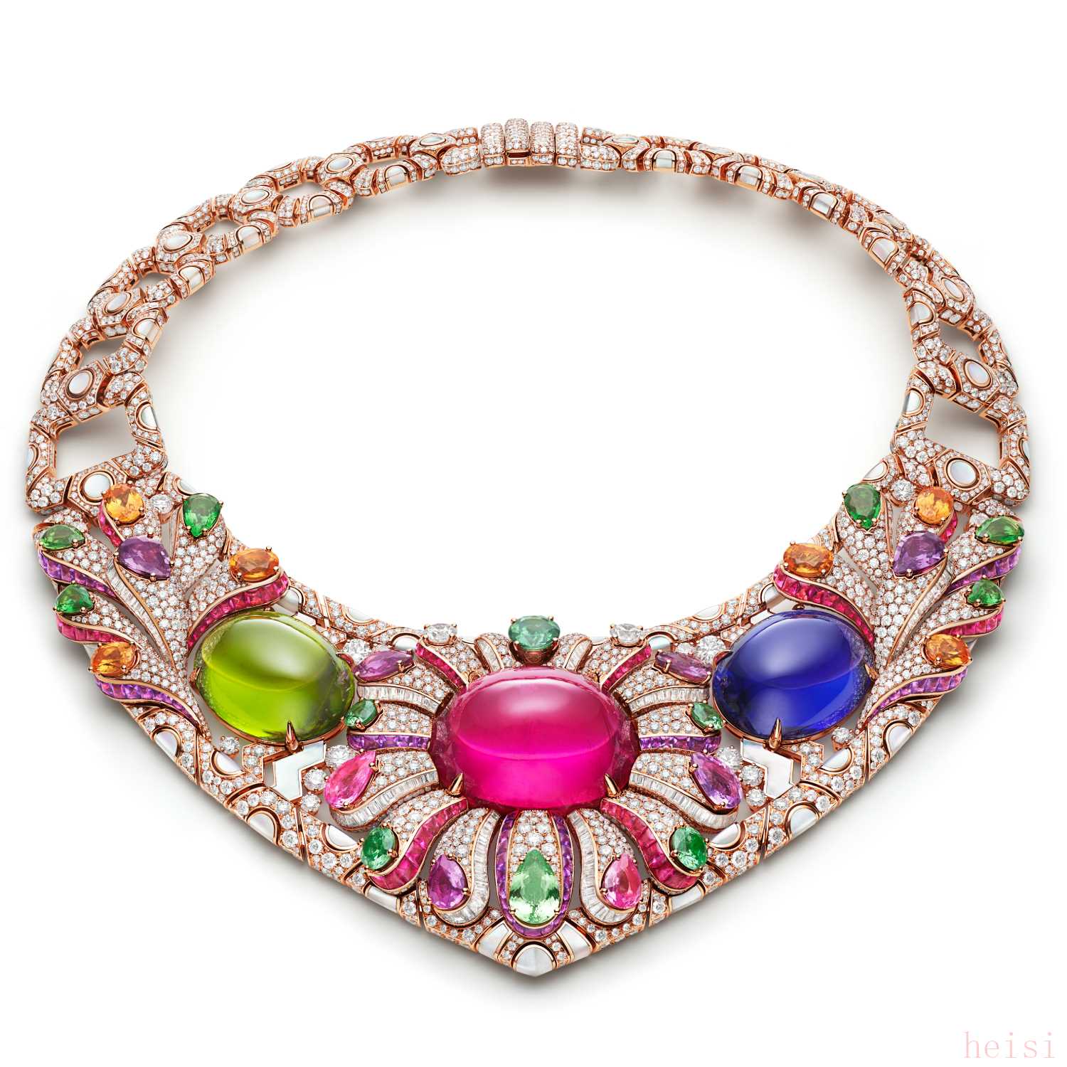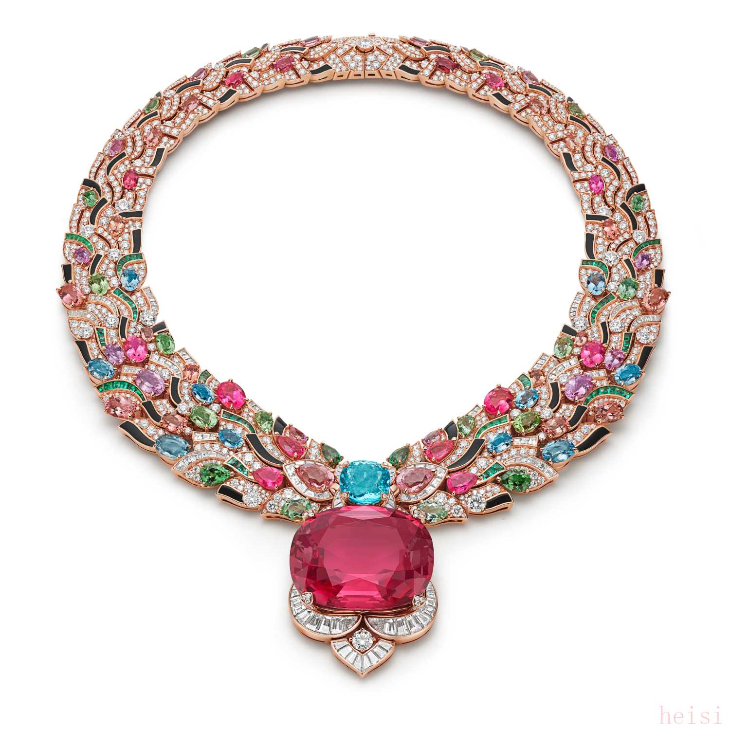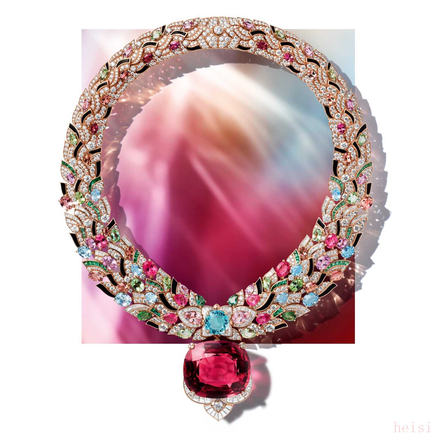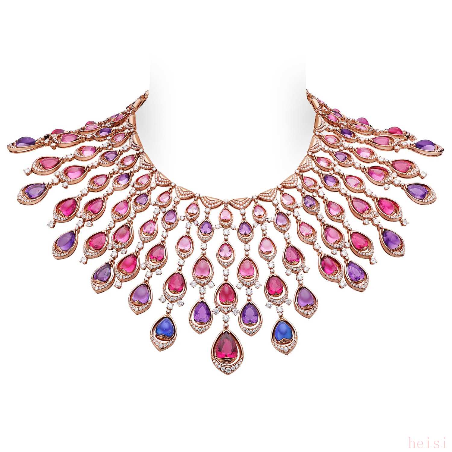 鑲嵌橢圓形和弧面切割紅碧璽、坦桑石、粉紅碧璽和紫水晶。鑲嵌圓形明亮式切割鉆石。