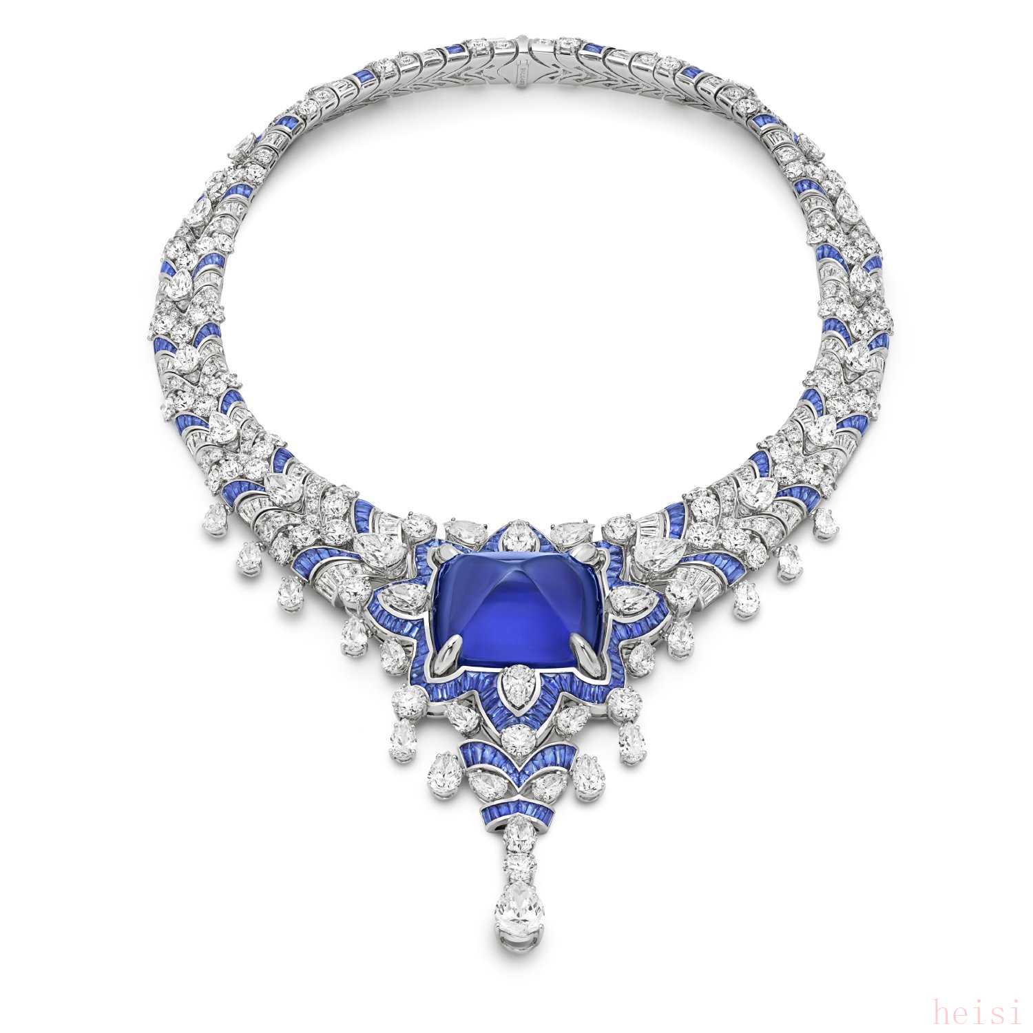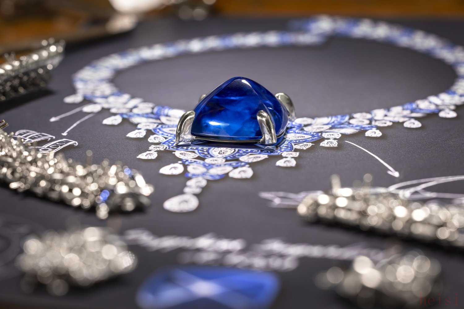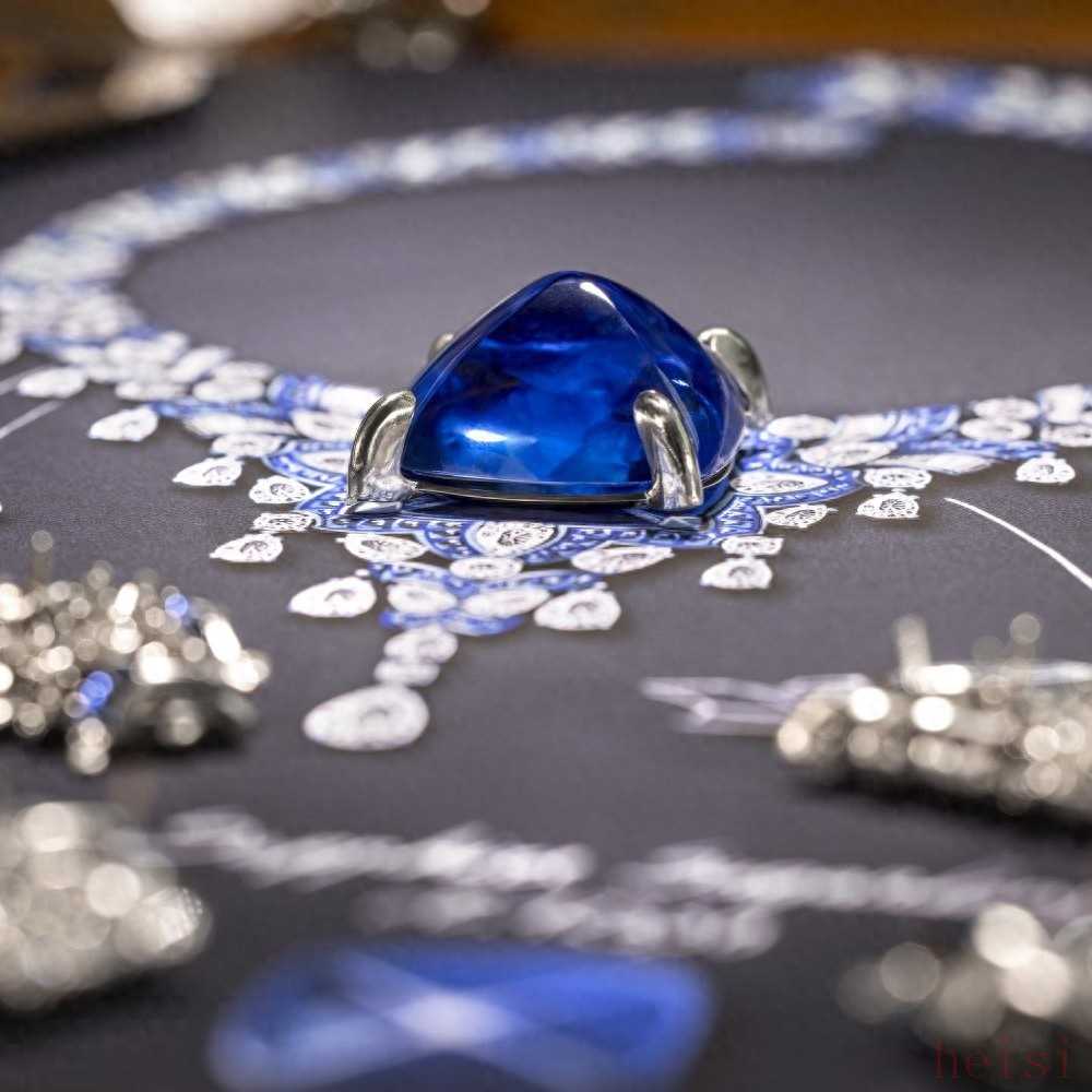 主石為一顆123.35ct糖面包山型切割藍寶石,經(jīng)鑒定產(chǎn)自斯里蘭卡。鑲嵌331顆藍寶石,13顆水滴形切割鉆石,以及橢圓形、階梯型和圓形切割鉆石。耗時1500小時制作。