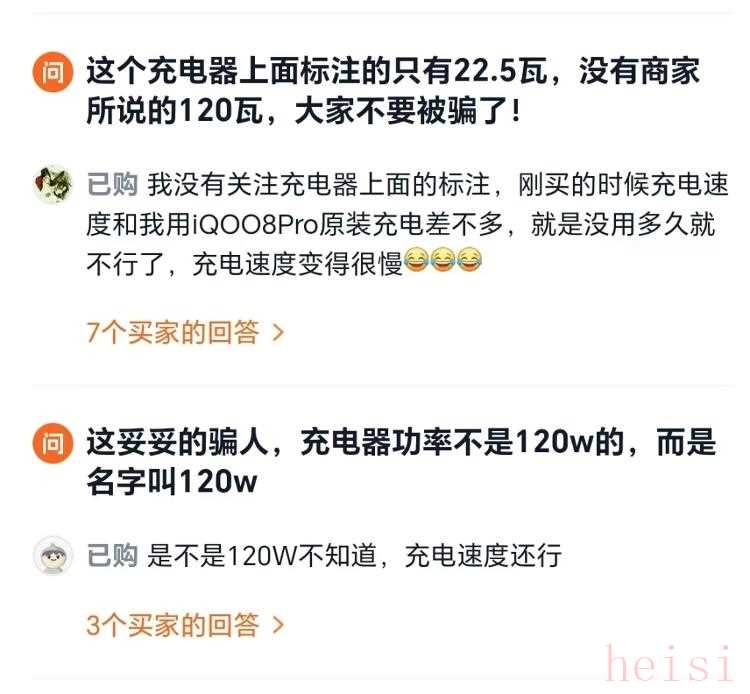 在一家宣稱“120MAX超級(jí)閃充”的店鋪,一位用戶說(shuō),“這個(gè)充電器上面標(biāo)注的只有22.5瓦,沒(méi)有商家所說(shuō)的120瓦,大家不要被騙了?!庇腥苏f(shuō),“我沒(méi)有關(guān)注充電器上面的標(biāo)注,剛買的時(shí)候充電速度和我用iQOO8Pro原裝充電差不多,就是沒(méi)用多久就不行了,充電速度變得很慢”。