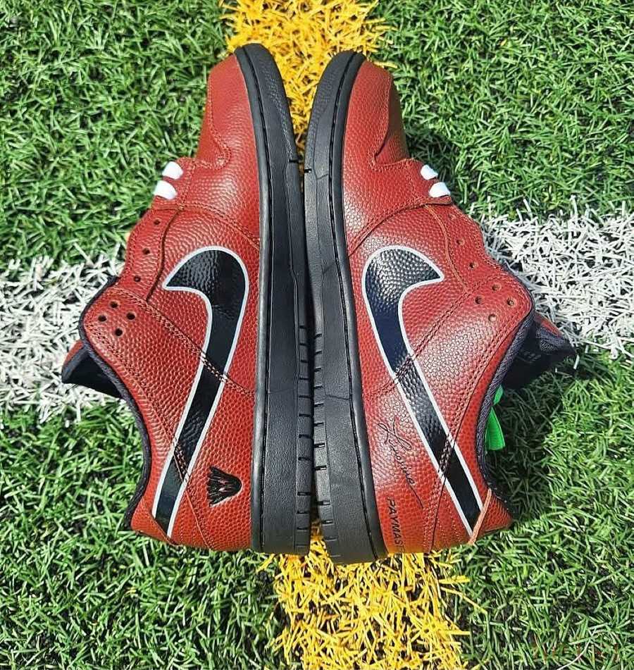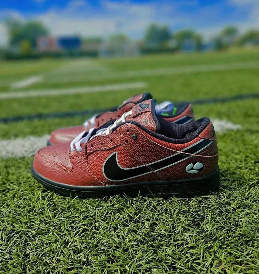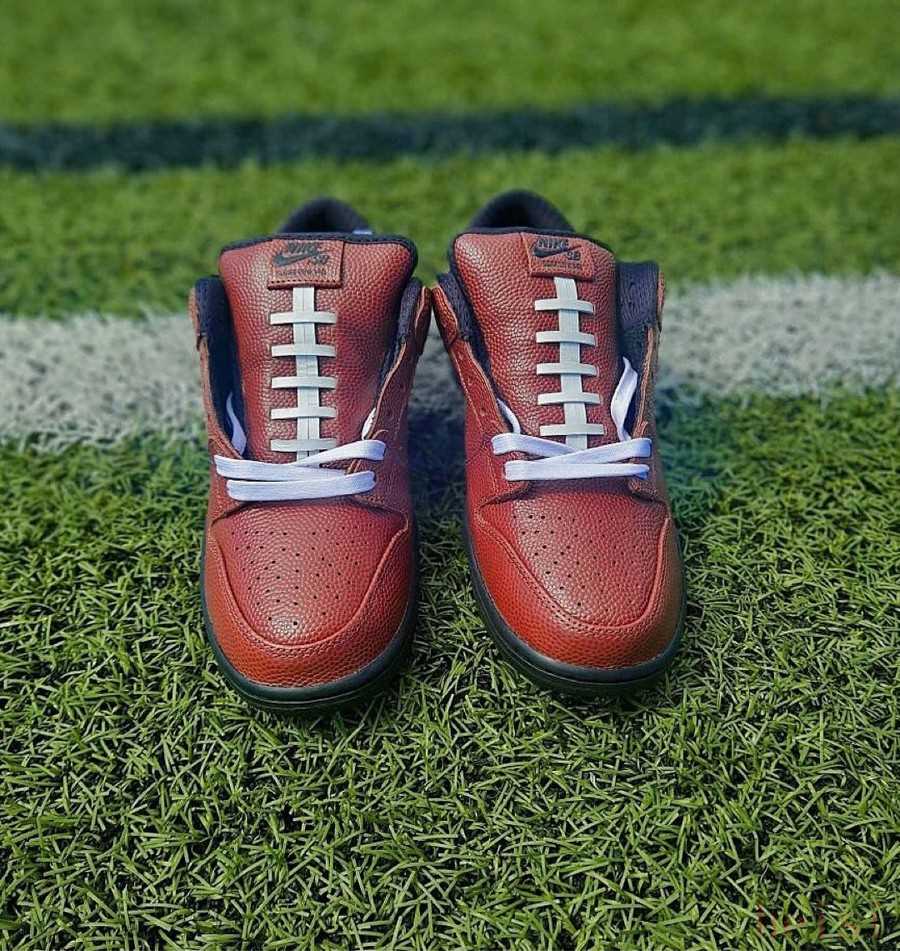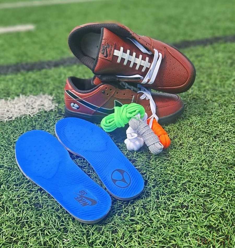 本次靈感源自美式橄欖球,鞋身采用標(biāo)志性的橄欖球皮革波點詮釋,鞋舌則將橄欖球上的車線重現(xiàn),結(jié)合后跟專屬 Logo 彰顯獨樹一幟的聯(lián)名身份,辨識度極高。