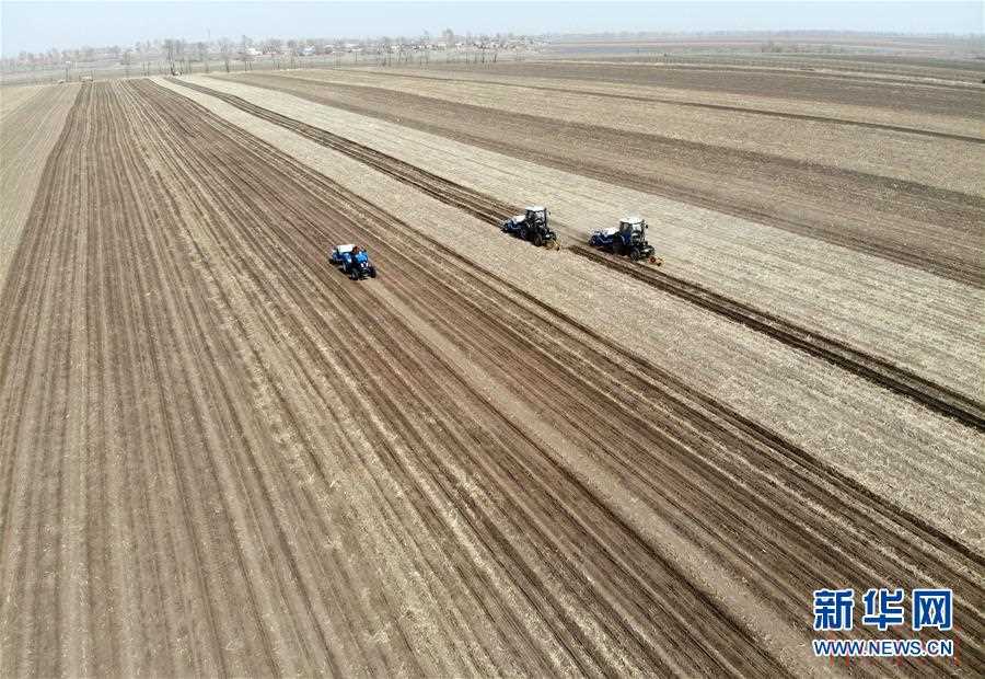 4月23日無(wú)人機(jī)拍攝的吉林省榆樹市弓棚鎮(zhèn)農(nóng)民在進(jìn)行春耕生產(chǎn)。新華社記者 林宏 攝