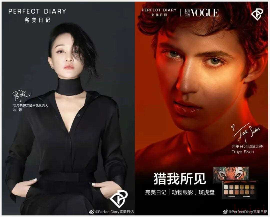 緊接著在產(chǎn)品有所保障的基礎(chǔ)上,品牌要甩掉低端網(wǎng)紅標(biāo)簽就需要再去營(yíng)銷層面展開行動(dòng)。為提升品牌的“檔次”,品牌最常用的方式就是找“咖位”更高的明星、“國(guó)民認(rèn)可度”更高的平臺(tái)來為自己背書。例如完美日記此前一直合作的明星大多是朱正廷、羅云熙等走流量路線的年輕藝人,他們自帶的流量是體量龐大的年輕女性群體。而今年雙十一前夕,完美日記官宣周迅成為代言人、國(guó)際知名創(chuàng)作歌手Troye Sivan(戳爺)成為品牌大使,很明顯就是朝著國(guó)際化、更高端市場(chǎng)進(jìn)發(fā)。