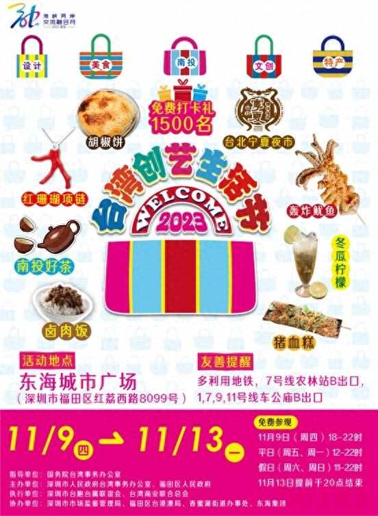 歡迎深圳市民闔家蒞臨,免費(fèi)參觀,每天都有限量打卡禮,超可愛臺灣茄芷袋零錢包總共1500份,送完為止。11月10日至13日還有滿額抽獎活動,幸運(yùn)得主可得到臺灣精選寶箱、南投專區(qū)限定禮、臺灣小吃大滿貫及各式臺灣農(nóng)特產(chǎn)、文創(chuàng)商品。詳情請見現(xiàn)場說明,抽獎名額有限,限量2000名,人人有獎,先抽先贏!