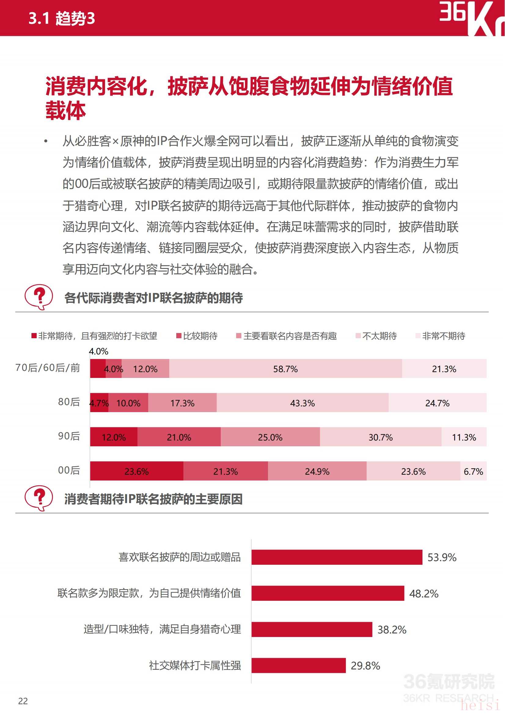 披薩正逐漸從單純的食物演變?yōu)榍榫w價值載體,呈現(xiàn)出明顯的內(nèi)容化消費趨勢:作為消費生力軍的00后或被聯(lián)名披薩的精美周邊吸引,或期待限量款披薩的情緒價值,或出于獵奇心理,對IP聯(lián)名披薩的期待遠(yuǎn)高于其他代際群體,推動披薩的食物內(nèi)涵邊界向文化、潮流等內(nèi)容載體延伸。在滿足味蕾需求的同時,披薩借助聯(lián)名內(nèi)容傳遞情緒、鏈接同圈層受眾,使披薩消費深度嵌入內(nèi)容生態(tài),從物質(zhì)享用邁向文化內(nèi)容與社交體驗的融合新階段。