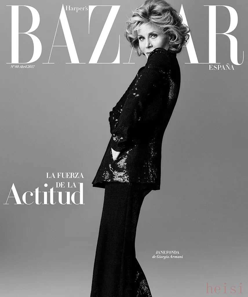 演員Jane Fonda身著Giorgio Armani套裝登上西班牙版《Harper's BAZAAR》2017年4月刊封面。
