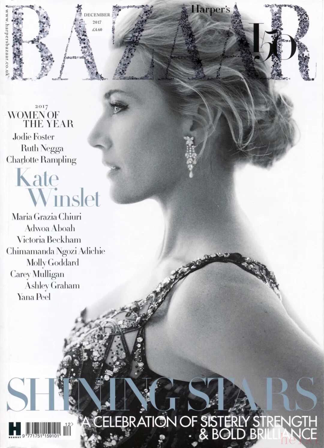 演員Kate Winslet身著Giorgio Armani Privé禮服登上英國(guó)版《Harper's BAZAAR》2017年12月刊封面。