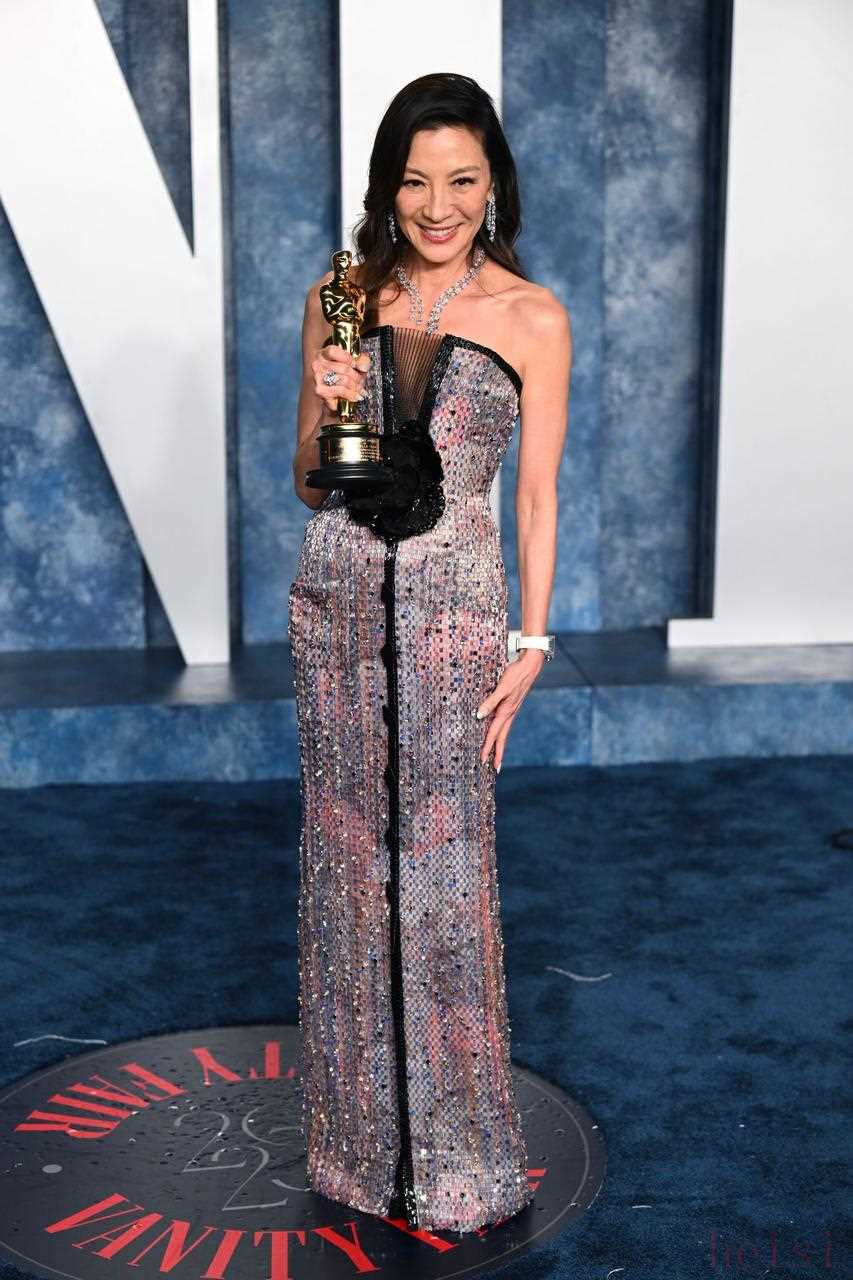 演員楊紫瓊身著飾有黑色玫瑰細(xì)節(jié)胸花的無(wú)肩帶Giorgio Armani Privé定制禮服。