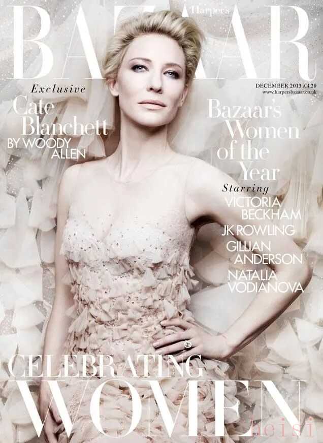 演員Cate Blanchett身著Giorgio Armani Privé禮服登上英國(guó)版《Harper's BAZAAR》2013年12月封面。