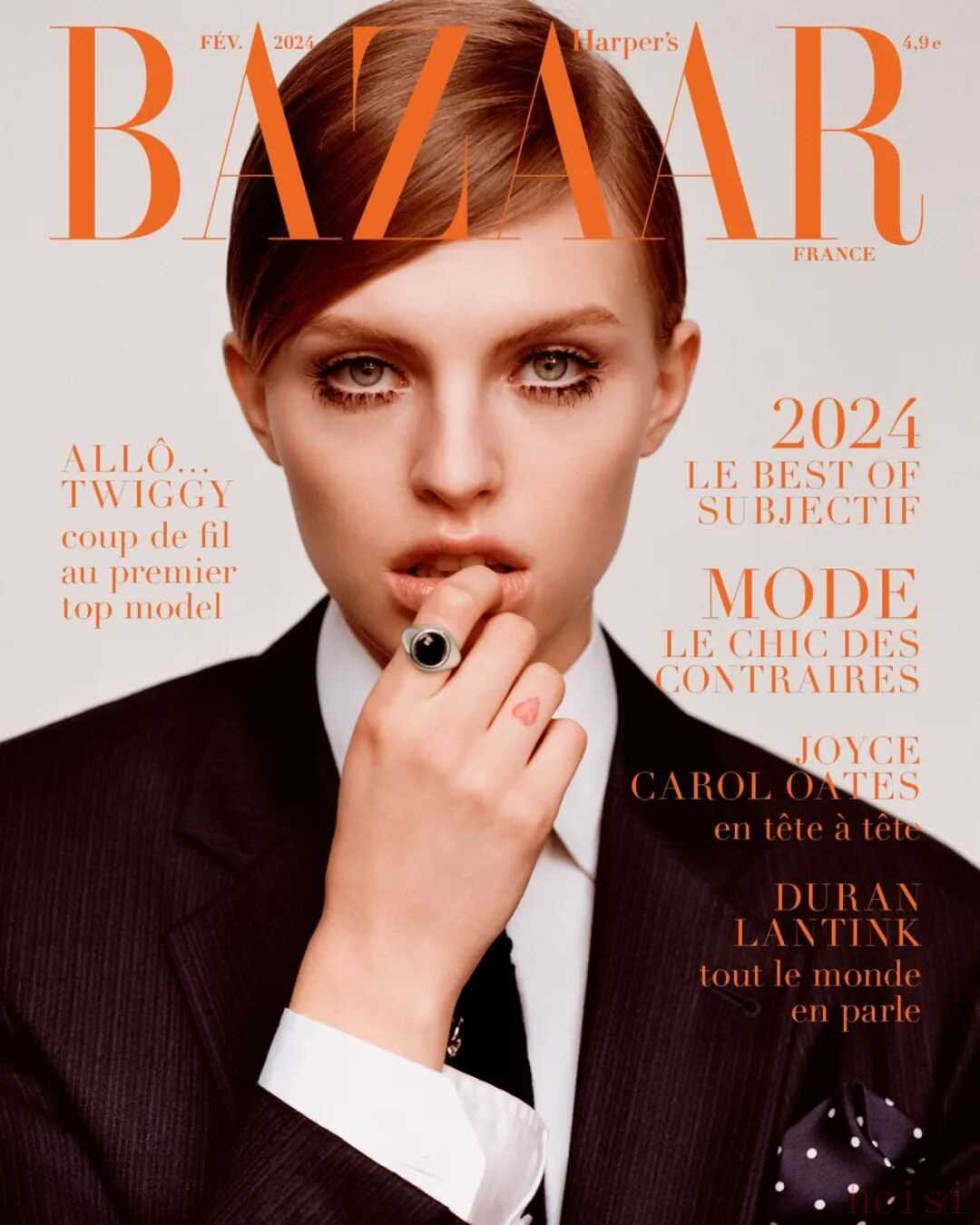 模特Karolina Spakowski身著Giorgio Armani套裝登上法國(guó)版《Harper's BAZAAR》2024年2月刊封面。