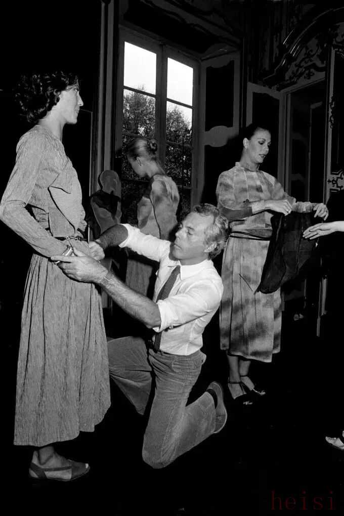 這位設(shè)計(jì)師在上世紀(jì)70年代中期創(chuàng)立了以自己名字命名的品牌,此前他曾在男裝品牌Cerruti任職。圖中,阿瑪尼正為他最早期的秀場(chǎng)之一——1978年春夏系列——做準(zhǔn)備
