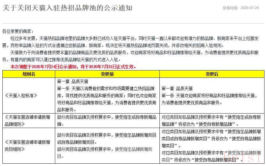 7月24日,天貓官網(wǎng)“天貓商家”頁(yè)面發(fā)布了一則《關(guān)于關(guān)閉天貓入駐熱招品牌池的公示通知》(以下簡(jiǎn)稱(chēng)《通知》),宣布“將天貓熱招品牌池頁(yè)面關(guān)閉,并修改相關(guān)的招商入駐規(guī)則”。本次調(diào)整將于2020年7月31日正式生效。