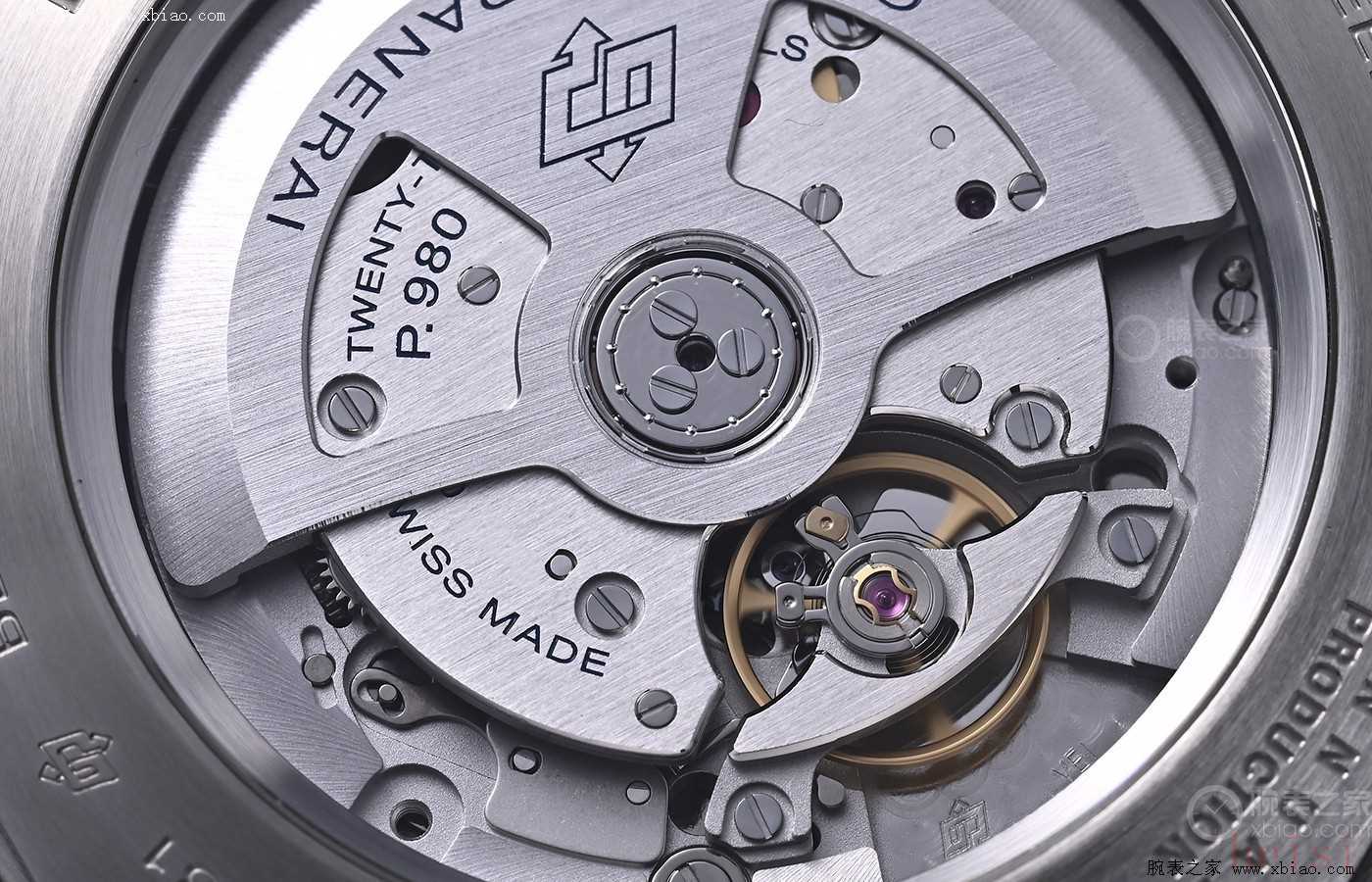 新款廬米諾MARINA腕表?yè)碛?00米防水性能的同時(shí),還引入了背透設(shè)計(jì)。藍(lán)寶石表底蓋下方搭載的是首次亮相的P.980型機(jī)芯。這枚機(jī)芯采用自動(dòng)上鏈構(gòu)造,擁有3天(72小時(shí))動(dòng)儲(chǔ),并具備停秒功能。