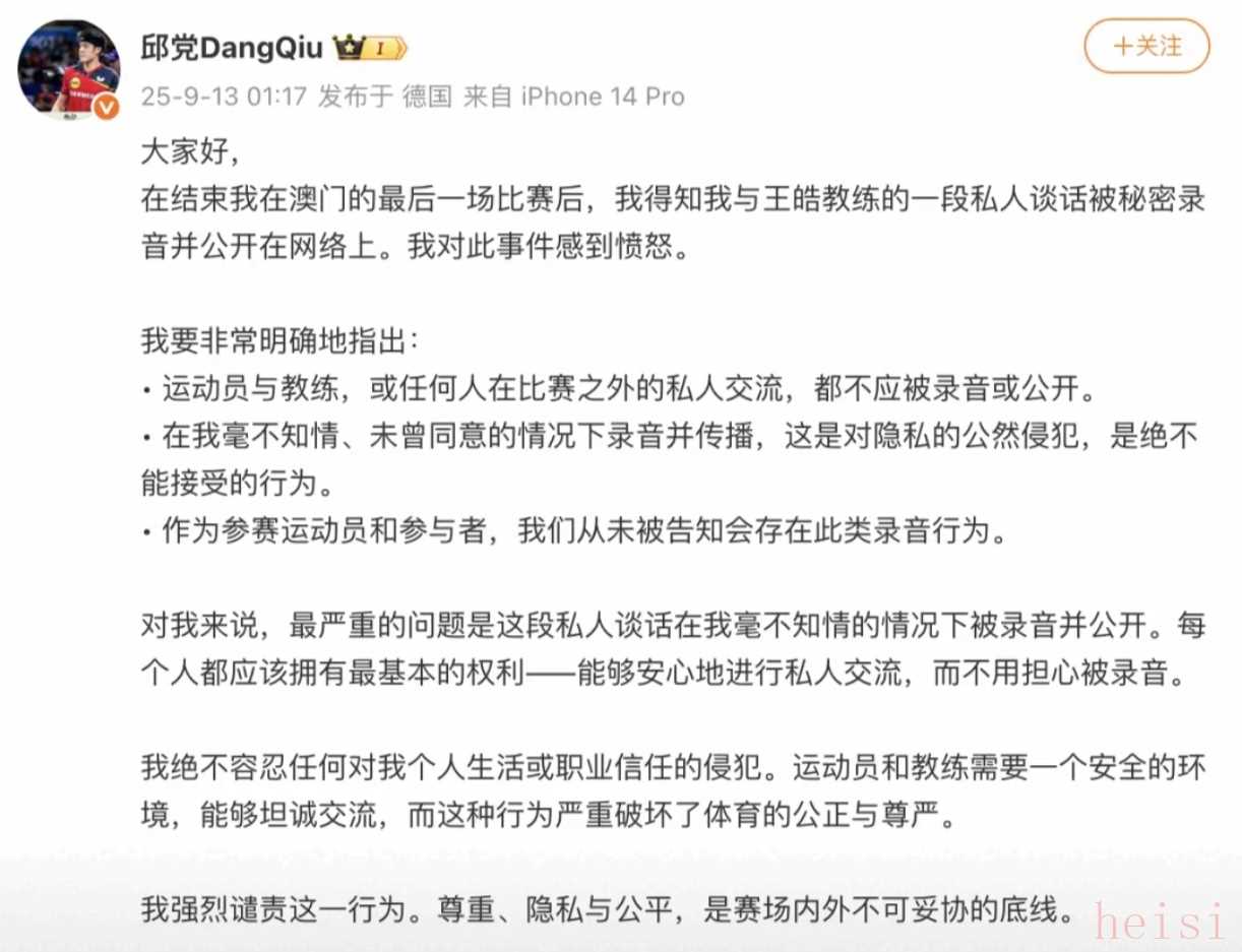 作為德籍華裔運動員代表,邱黨在聲明中連用三個加粗的符號強調(diào)立場:運動員與教練間的私人交流具有天然保密屬性未經(jīng)同意的錄音傳播屬于嚴(yán)重侵權(quán)"賽事主辦方從未提前告知監(jiān)控措施"。字里行間既展現(xiàn)出職業(yè)運動員的克制,又透露出對信任體系崩塌的深切憂慮。特別值得關(guān)注的是,聲明特意選用中文發(fā)布,折射出跨國體育交流中的復(fù)雜語境。